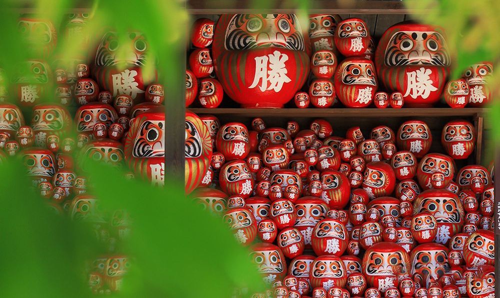 ▲ 【胜尾寺-达摩不倒翁】寺内千尊达摩承载的香客祈愿,您可亲手填写心愿;亦可打卡寻宝,集齐寺内六色印章,最终兑换满载祝福的开运明信片。