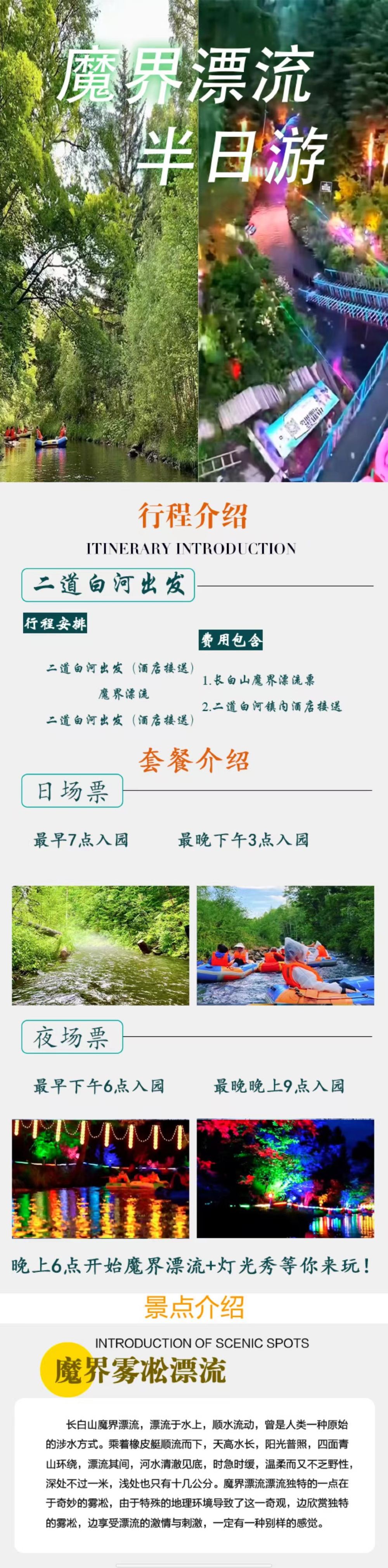 二道白河上门接送 | 夜场灯光秀+长白山魔界漂流半日游【2人起定,含往返交通+漂流门票】