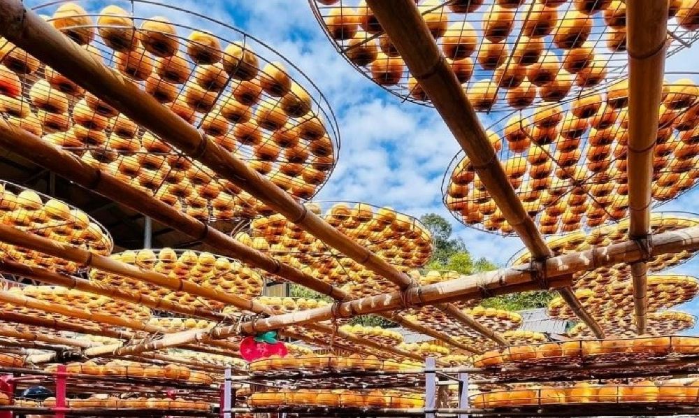 ▲ 新埔柿餅已有百年歷史,尤其是旱坑因地理環境,特別乾旱,加上新竹特有強勁、乾燥的九降風,是製作柿餅的天然條件。而我們依舊遵循古老的陽光曝曬、九降風風乾及木材炭烤,把古早甜而不膩、香Q的好味道,傳承下來。而日曬柿餅更是秋收的風景,農場後方山坡地栽種有兩棵柿子樹,遊客可以自由參觀、拍攝及學習。味衛佳柿餅觀光農場以教導製作柿餅及柿果生態教學為名,充分呈現柿餅的製作過程,甚至保留了200 多棵柿子樹不採果,才能做生態教學活動。
