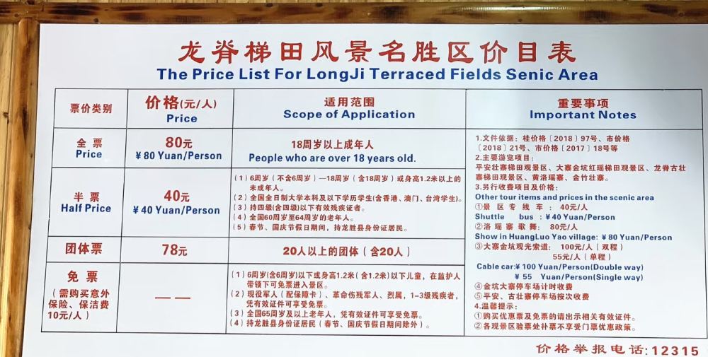 ▲ 景区门票收费标准公示:成人80元/人,6周岁以下或65周岁以上(免票),6周岁至18周岁或60周岁至65周岁(半票40元/人),现役军人,退役军人,残疾证均有不同的优惠政策,如:对景区门票优惠政策有疑问者,建议拍免票人群通道(车位费/不含门票),产生门票现补。