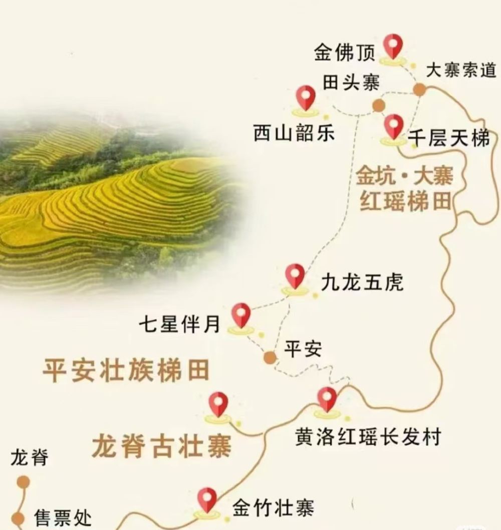 ▲ 平安壮寨梯田有“七星伴月”和“九龙五虎”两大著名景观,景色秀美飘逸;