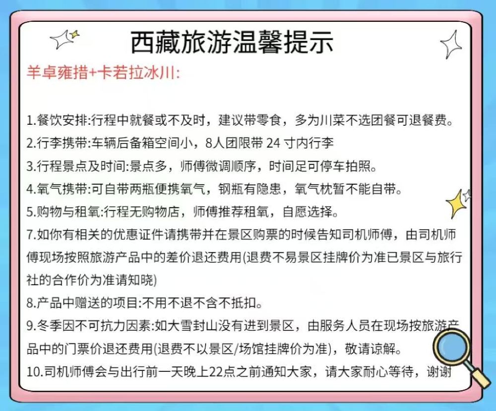 D. 含中餐 (14-28 人团):午餐 (20 元)、拉萨至景区往返用车 (15-29 座)、早上集合点集合,下午集合点散团雅江河谷 (15 分钟)、羊湖 4 号、5 号 (各 30 分钟)、卡若拉冰川 (1 小时)