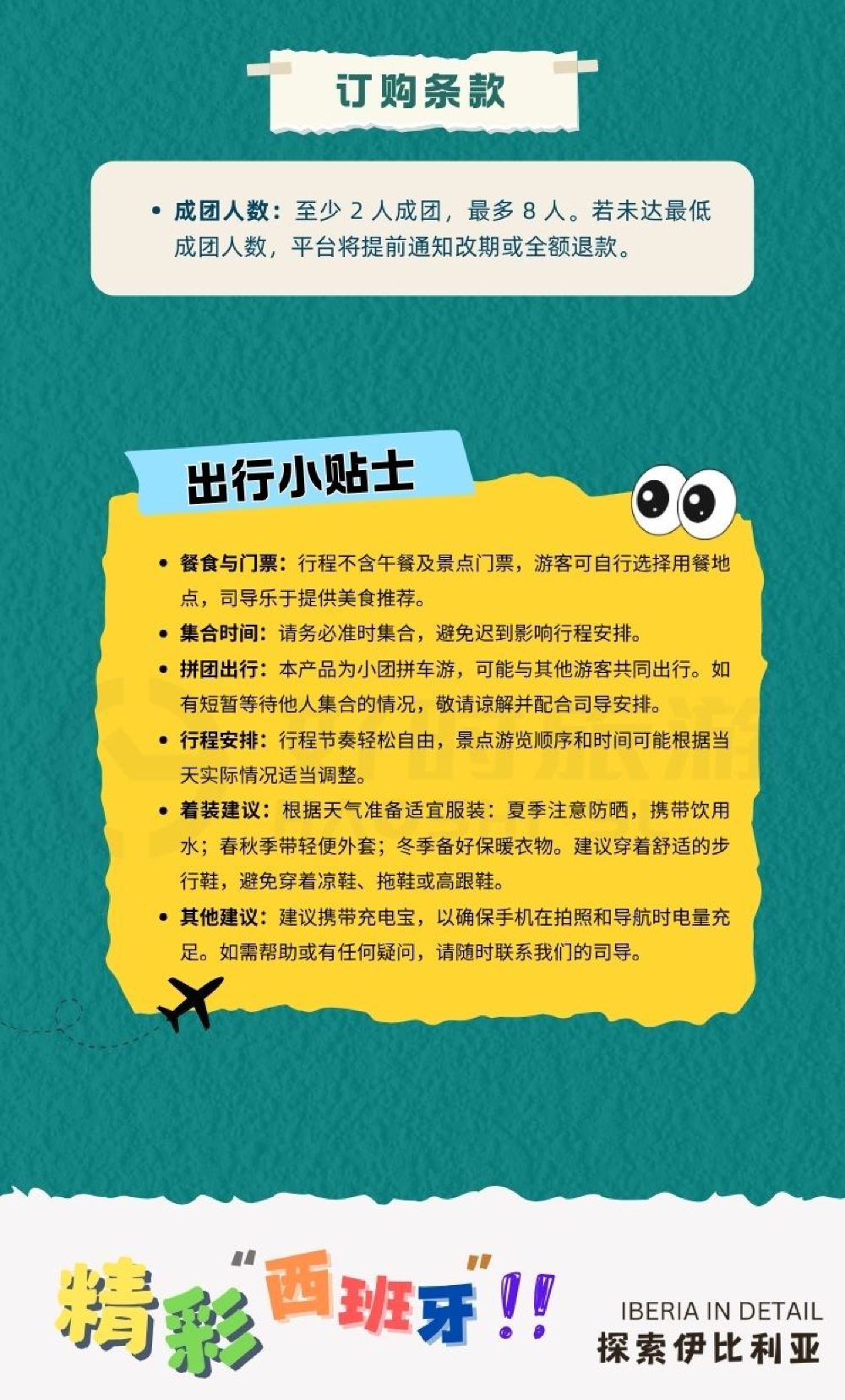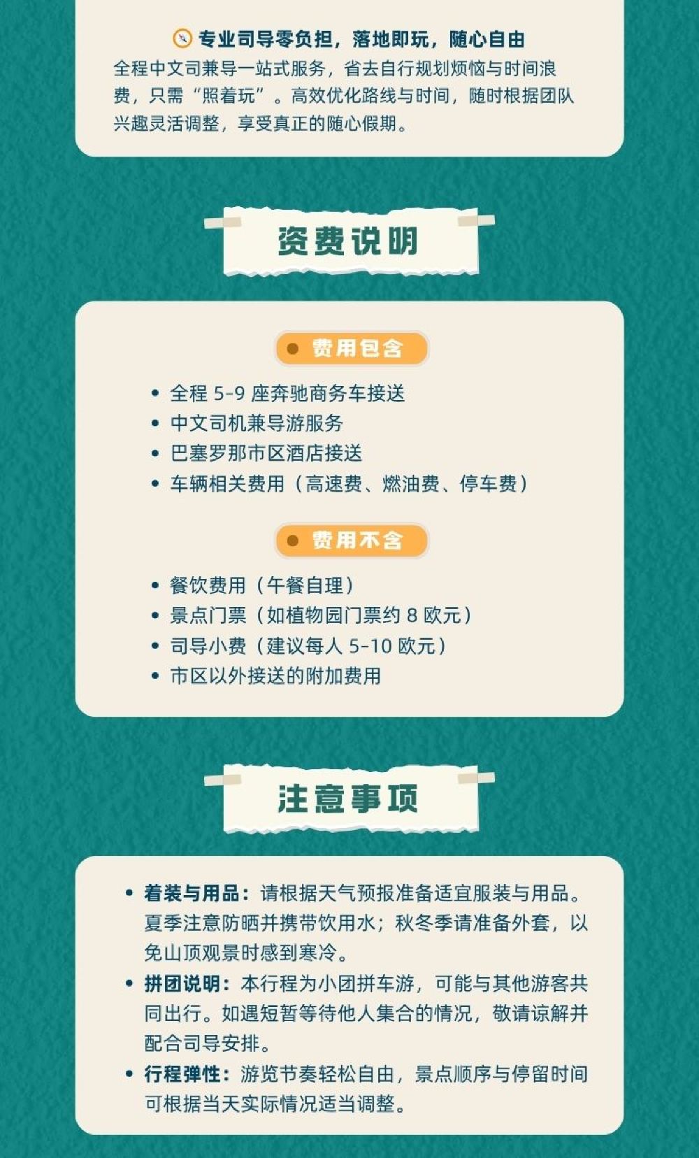 【其他说明】1、行程中的用车时间为当地时间,冬令时出发时间提前1小时。2、周末、节假日出行,因部分城市或景点涉及堵车、人流量、交通管制等因素,司机会停靠在距离景区最近的上下客点,如导致无法游览等情况,我司不承担任何责任,给您带来的不便,望谅解。3、行程中的景点游玩顺序会根据实际情况和天气状况进行调整。