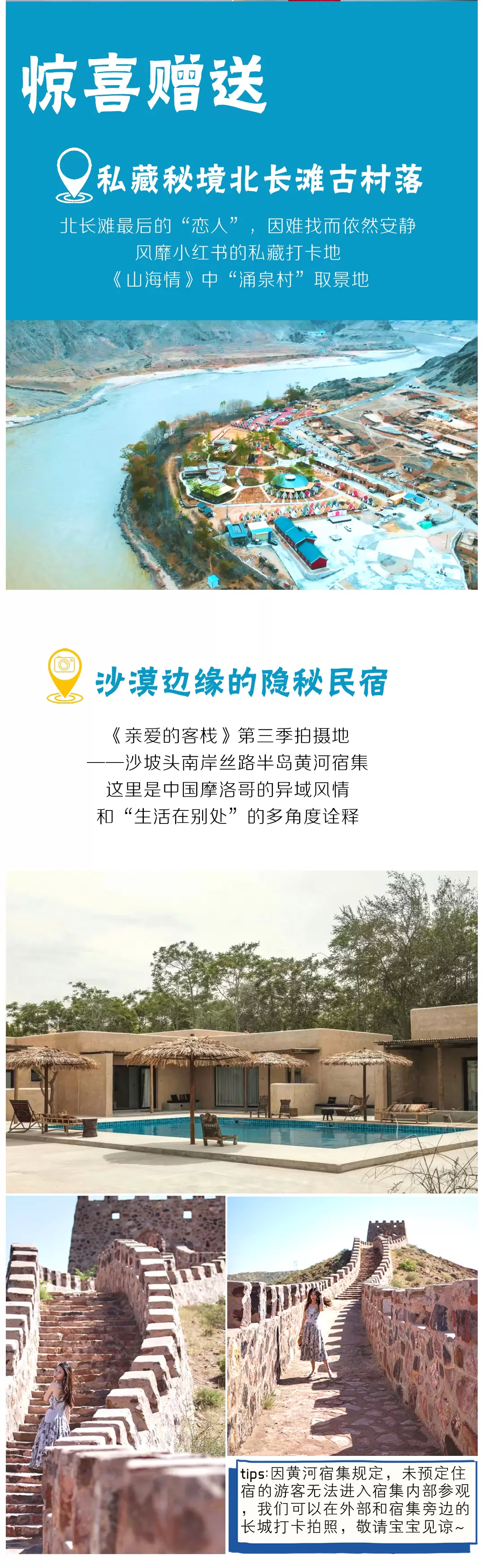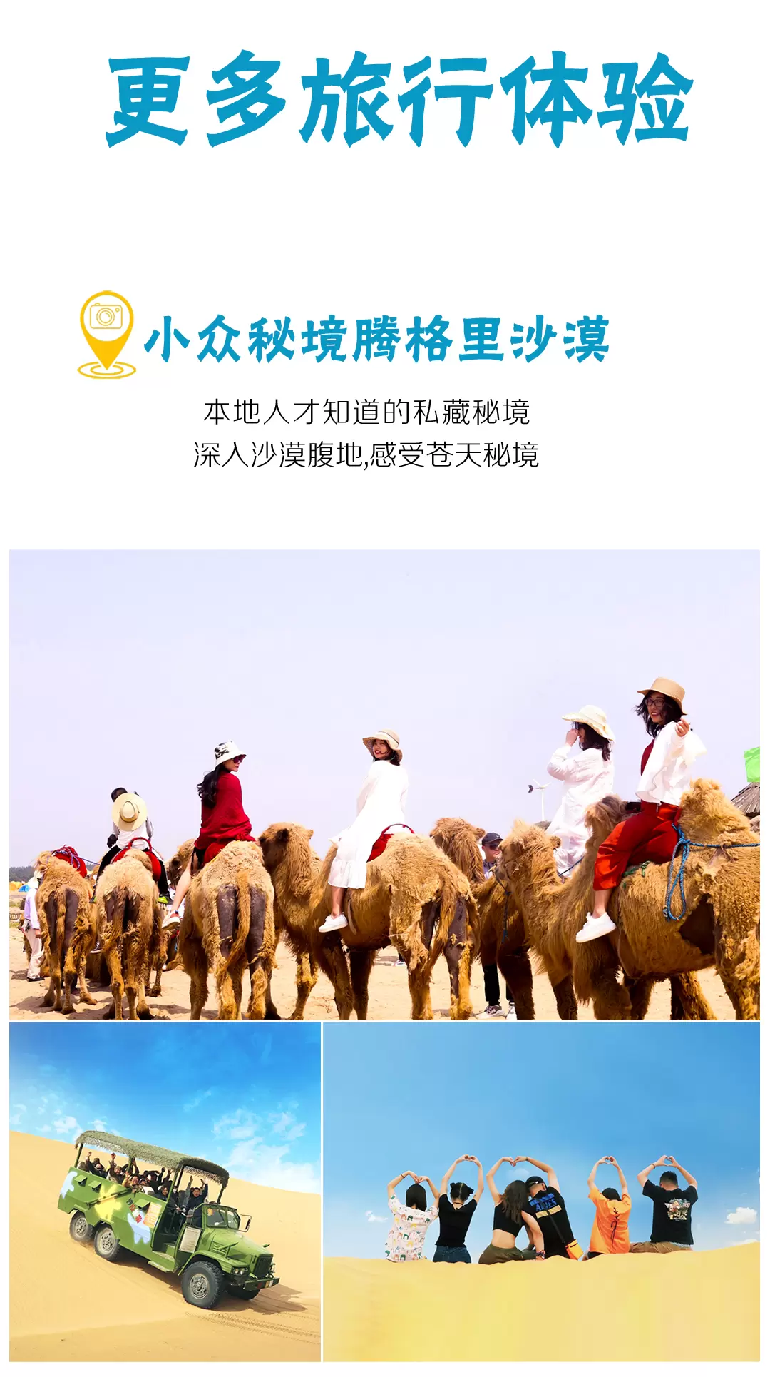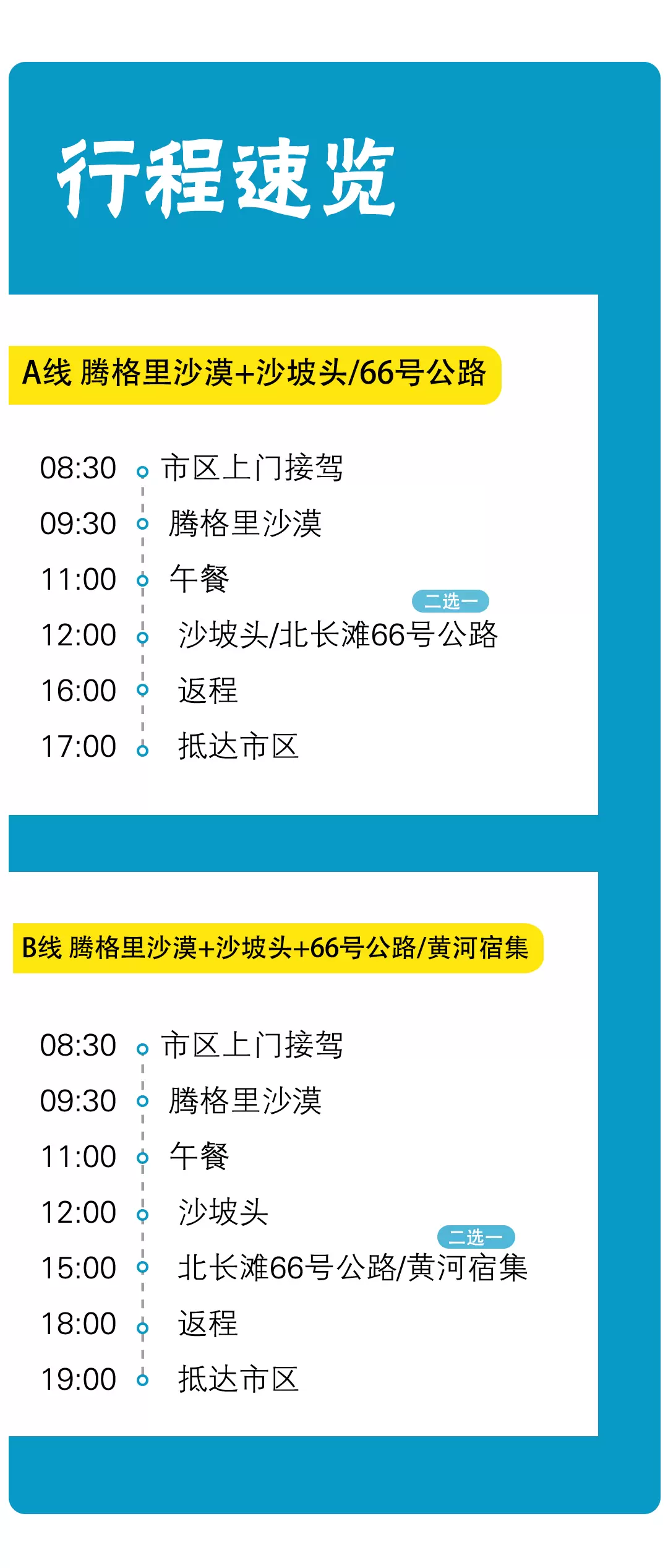 温馨告知:1、由于66号公路是山区路段,经常会因为天气/修路/临时管控等不可控的因素,随时出现封控的情况,且没有专门相关部门及时发布具体情况,所以是否能正常游览只能看当天具体开放情况。如遇66公路封控,我们将会改为打卡通湖草原(门票自理)/网红99号公路(无需门票)【二选一】2、退费说明:因为66号公路无需门票,故因为不可抗力因素导致66号公路无法游览,无退费,如果不愿意此方案的游客宝宝,可直接选择我们的套餐【腾格里沙漠+沙坡头】,下单即默认已知晓此方案,行程当天不在解惑,望理解~~~