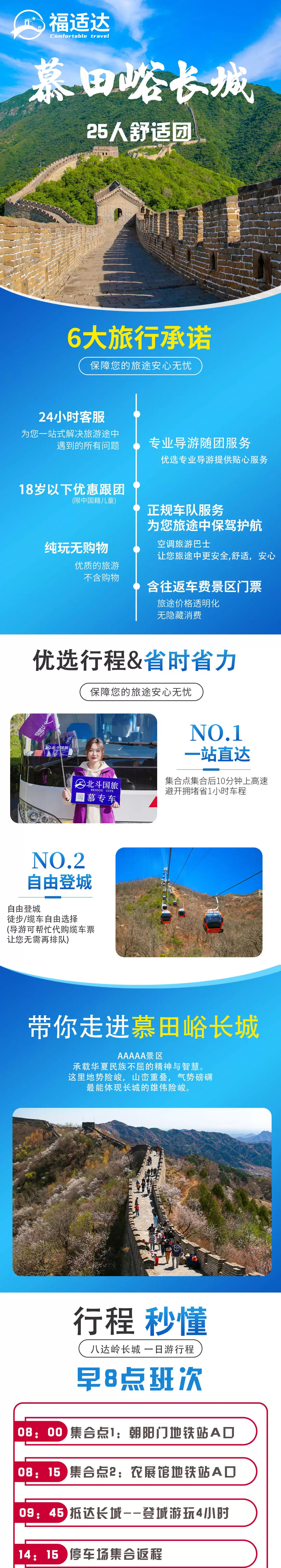 北京慕田峪长城一日游【2+1航空座椅29人团◆9点班次◆纯玩无购物◆4小时游玩时间◆可选五环上门接】