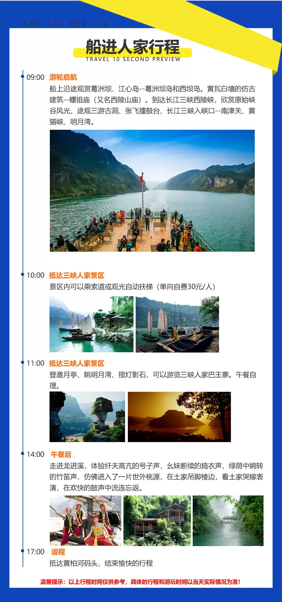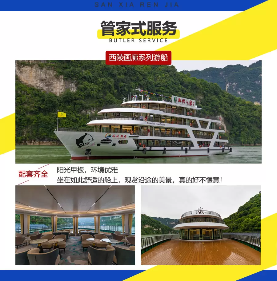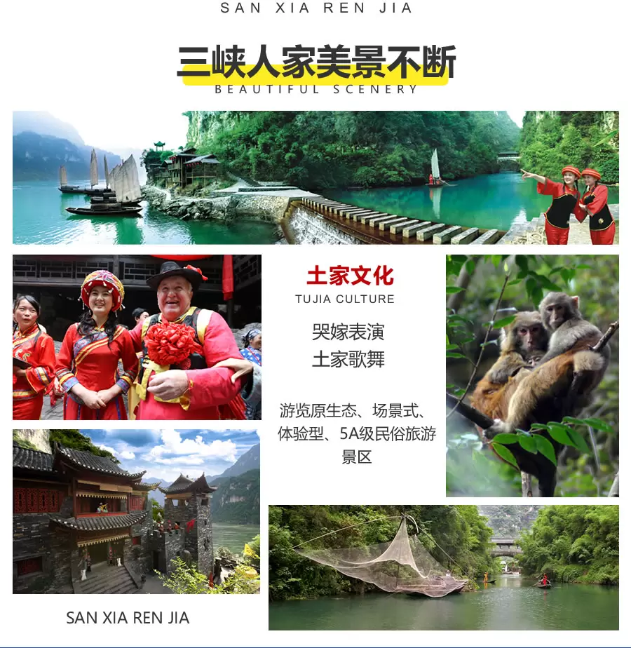 1.乘西陵画廊系列游船走进三峡人家,经典线路不同玩法。游览5A级三峡人家,感受土家文化,欣赏哭嫁等歌舞表演。