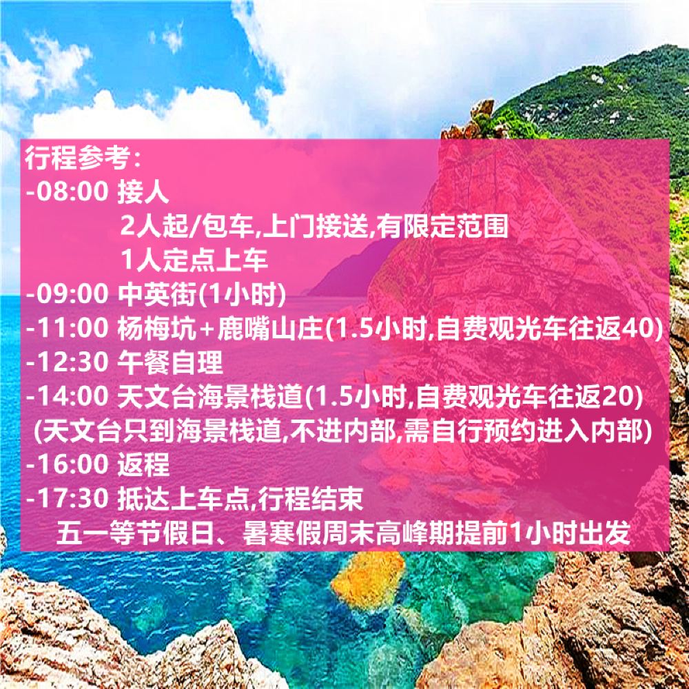 行程:接人-中英街-杨梅坑+鹿嘴山庄+天文台海景栈道-返回