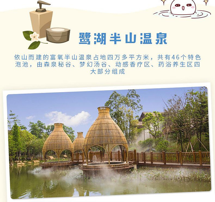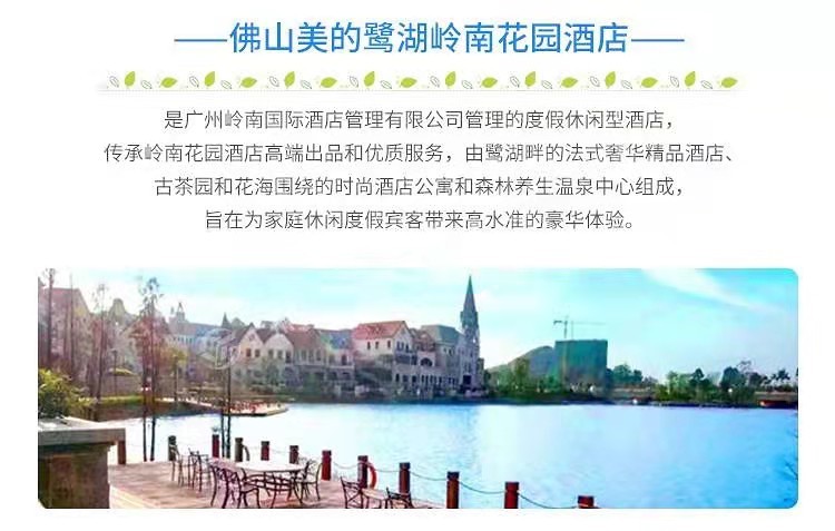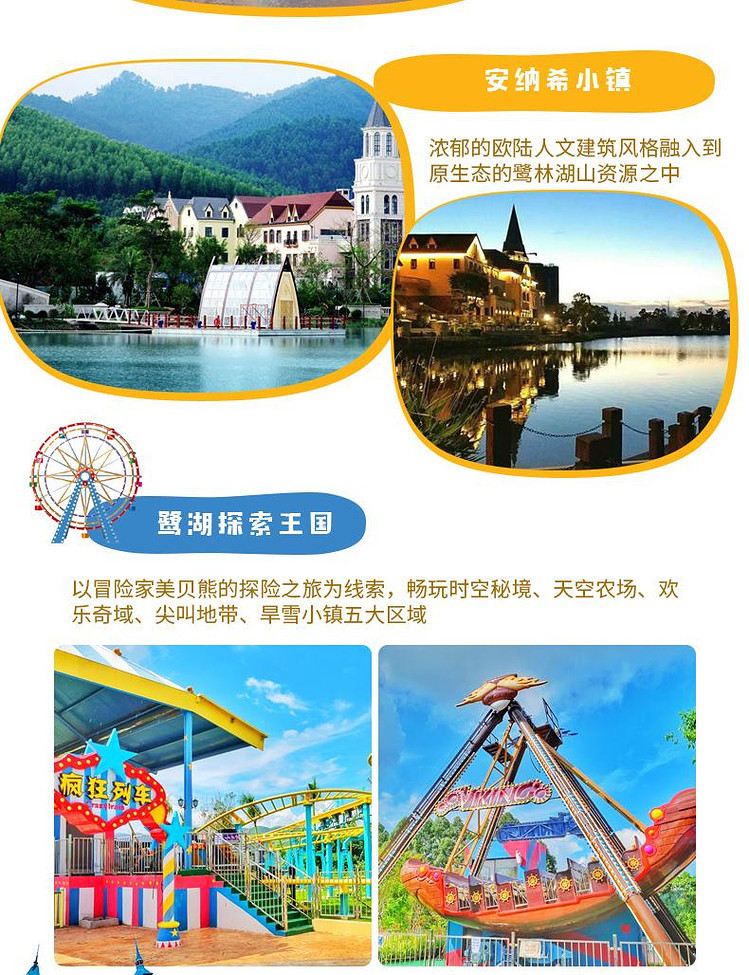 推荐理由:1、古茶园和花海围绕的时尚酒店公寓,离度假区各个园区都很近。2、全系度假王国,半山温泉、仙境花海、探索王国、欧洲小镇……诸多乐趣等着你。3、探索王国过一把探索瘾,40多项机动游戏和大型娱乐设施;爱丽丝庄园,仙境花海,赏花拍照不二之 选。鹭湖阁餐厅以星级酒店餐厅的规格打造,优雅闲适的环境让人全身投入享受舌尖上的好滋味。海鲜南瓜奶油汤、迷你凯撒沙律、炭烧雪花牛仔骨、澳洲 T 骨牛扒、黑椒牛柳炒意粉、炸地瓜丸……各色美食为您带来一场舌尖上的享味之旅。