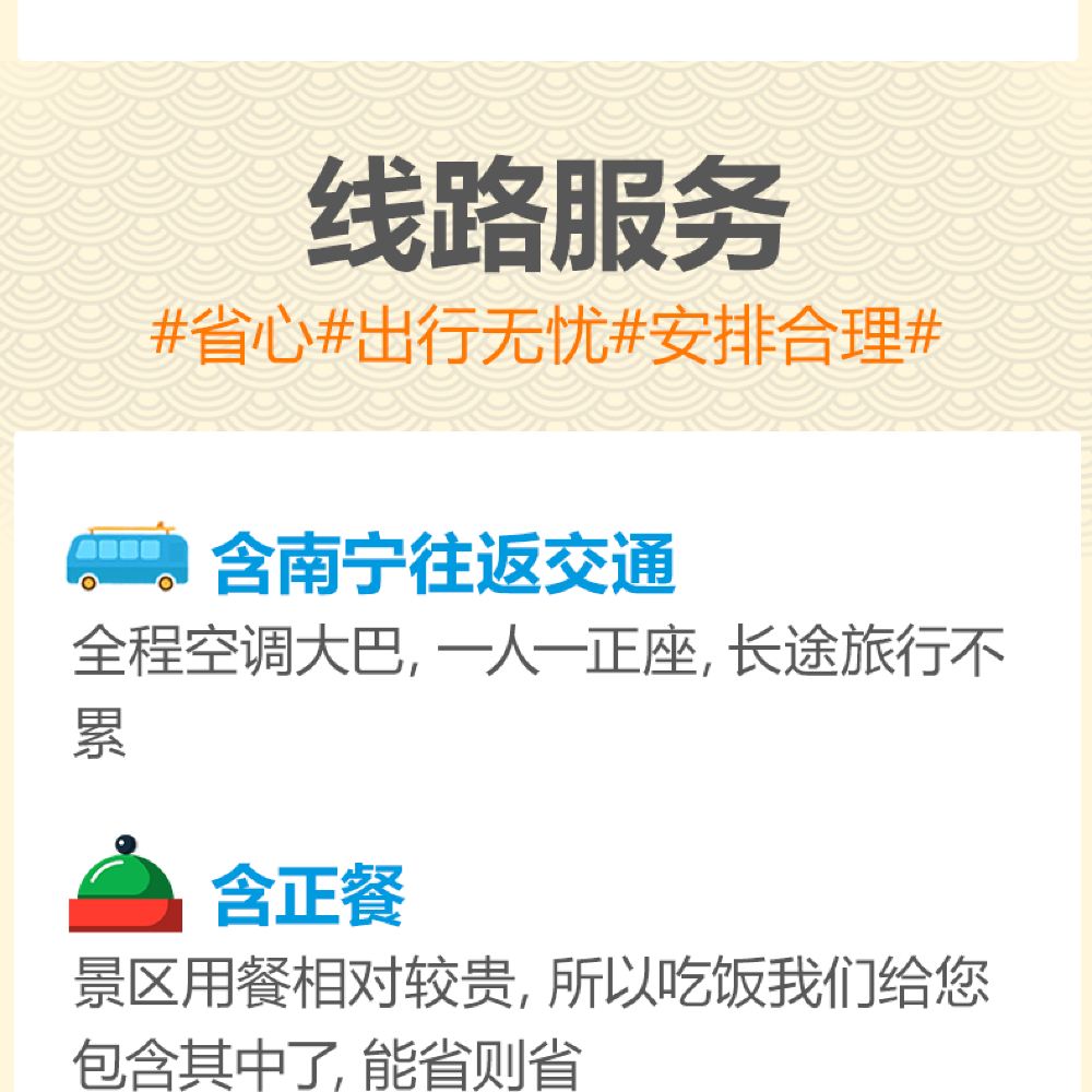 3、本产品为散客拼团,根据发团需要,本产品将会在部分行程段发生团友、导游或用车调整变化,有可能与相近方向的发班线路的团友拼车拼团出游,敬请知晓与谅解;