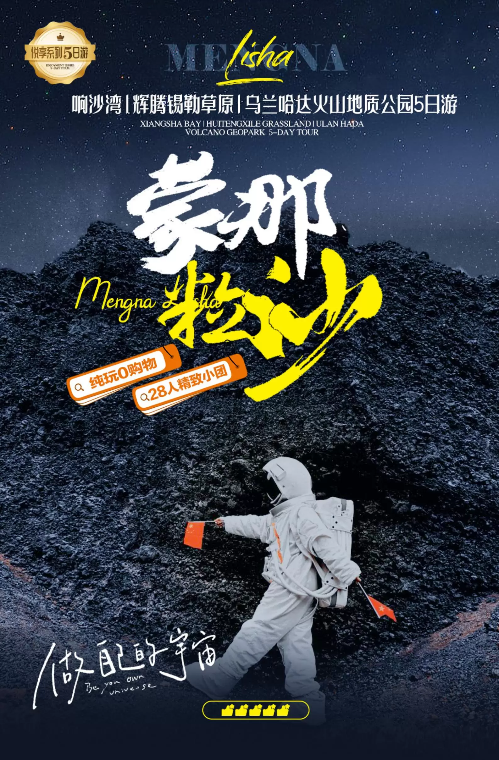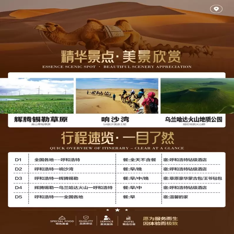 响沙湾+辉腾锡勒草原+乌兰哈达火山地质公园五日游【纯玩丨下马酒+手扒肉+诈马宴+篝火晚会丨蒙古包+免费接送机】