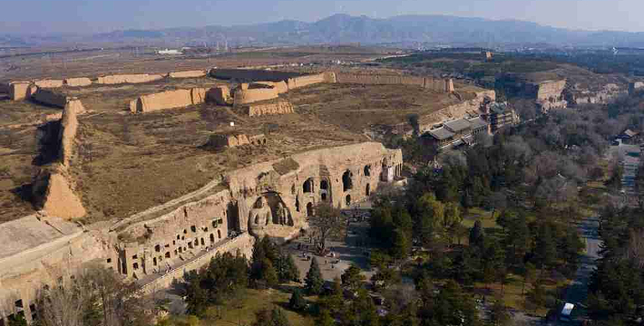 云冈石窟位于中国山西省大同市城西约16公里的武州(周)山南麓、武州川的北岸,地理位置为东经113º20’,北纬40º04’。石窟依山开凿,规模恢弘、气势雄浑,东西绵延约1公里,窟区自东而西依自然山势分为东、中、西三区。现存主要洞窟45个,附属洞窟209个,雕刻面积达18000余平方米17米2厘米,佛龛约计1100多个,大小造像51000余尊。云冈石窟距今已有1500年的历史,是佛教艺术东传中国后,是公元5世纪中西文化融合的历史丰碑。1961年3月被国务院公布为首批全国重点文物保护单位;2001年12月被联合国教科文组织批准列入“世界文化遗产”名录;2007年5月成为国家首批5A级旅游景区。云冈石窟原名武州(周)山石窟寺,明代改称云冈石窟。北魏地理学家郦道元《水经注·灅水》记载:“武州川水又东南流,水侧有石,祗洹舍并诸窟室,比丘尼所居也。其水又东转迳灵岩南,凿石开山,因岩结构,真容巨壮,世法所稀,山堂水殿,烟寺相望,林渊锦镜,缀目新眺”。作为北魏建都平城(今山西大同)时期的大型石窟寺文化遗存,是从北魏文成帝复法启开凿之始,到北魏正光年间终结,大致历经了近70年之久,石窟艺术内容丰富,雕饰精美,是当时统治北中国的北魏皇室集中全国技艺和人力、物力所雕凿,是由一代代、一批批的能工巧匠创造出的一座佛国圣殿,它以壮丽的典型皇家风范造像而异于其他早期石窟,展现的佛教文化艺术涉及到历史、建筑、音乐等多方面内容。它是东方石雕艺术的精魂,也是中西文化融合的典范,亦代表着公元5-6,在中国乃至世界艺术史上占有重要地位,与敦煌莫高窟、洛阳龙门石窟并称为中国三大石窟,亦与印度阿旃陀石窟、阿富汗巴米扬石窟并称为世界三大石雕艺术宝库。