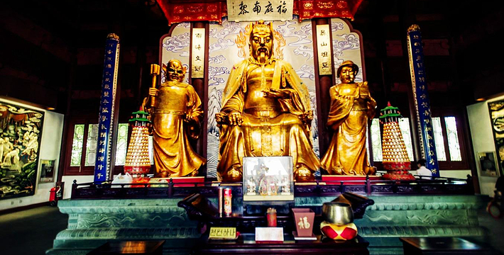 城隍阁二层东楹柱悬明代徐渭名联“八百里湖山知是何年图画,十万家烟火尽归此处楼台”。底层大厅南、西、北三面,倚壁设灯光橱窗展示大型硬木彩塑《南宋杭城风情图》,对面嵌壁青石线刻画描绘杭州历代名贤画像和10个民间神话故事。三到顶层都有休闲服务设施。上吴山,登城隍阁,举目四望,穹宇莽苍,大地坦荡,湖山秀靓,城市兴旺,好一处名不虚传的人间天堂!