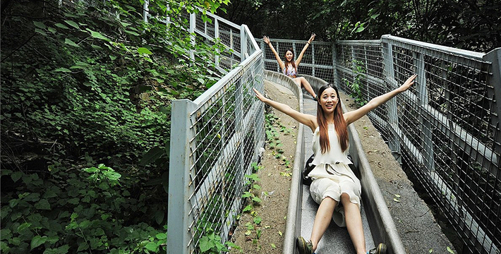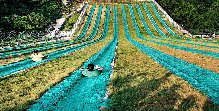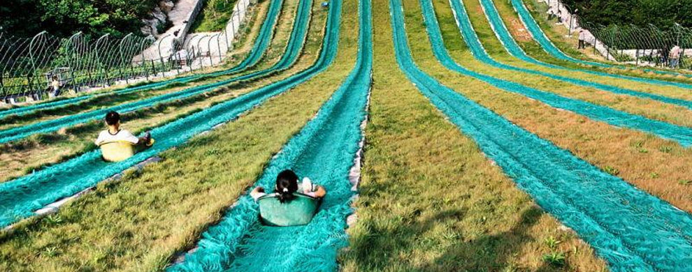 大天池斜斜的草坡上,那九道窄窄的绿色滑道,是不是像一帘帘横空下泻的瀑布呢?游人从100多米高处一溜儿滑下来,那感觉是既惊险又刺激。