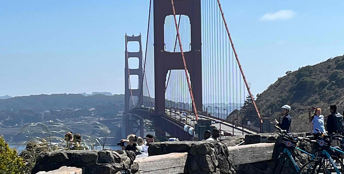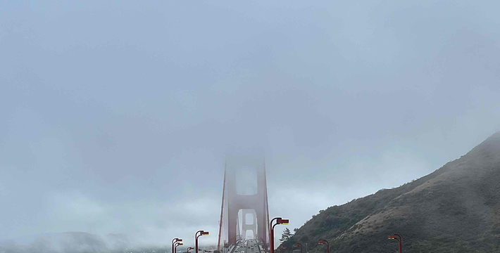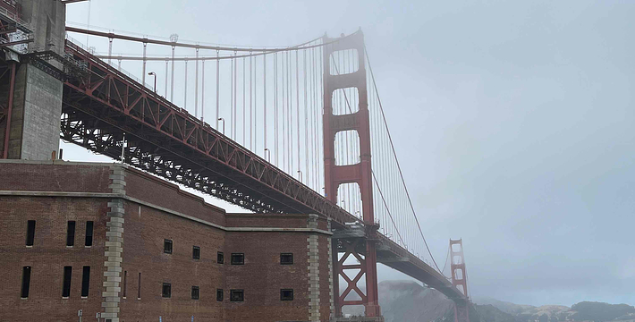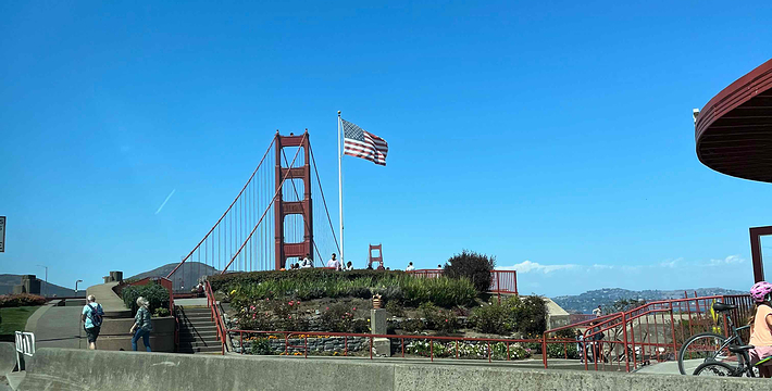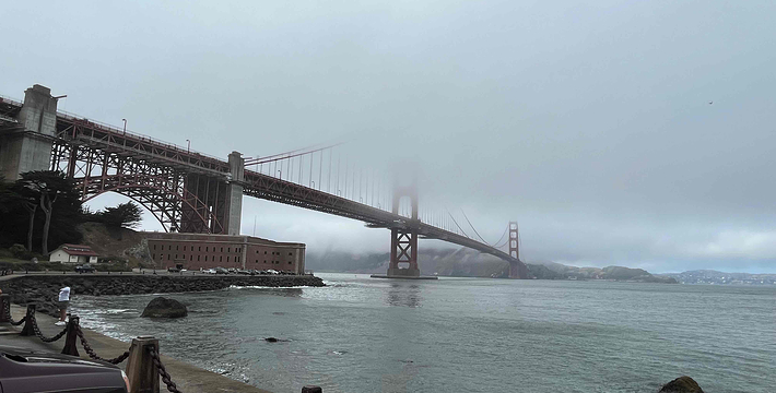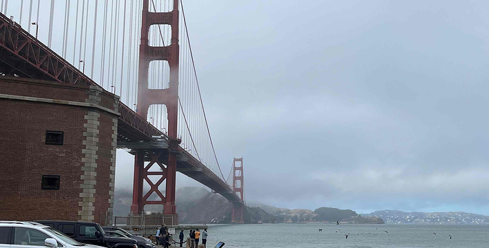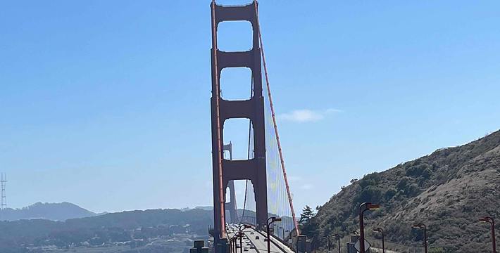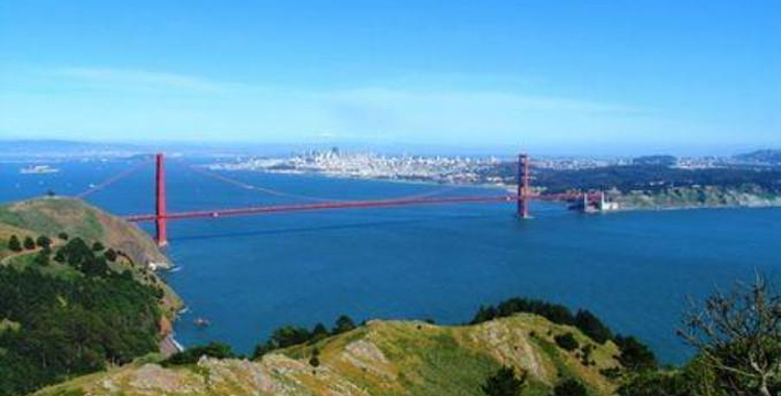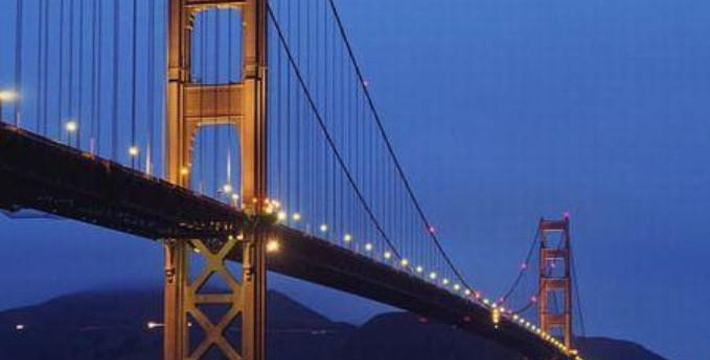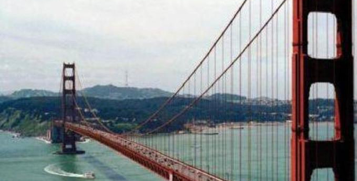 金门大桥(Golden Gate Bridge)是美国旧金山市的标志性建筑。它跨越联接旧金山湾和太平洋的金门海峡,南连旧金山的北端,北通加州马林县,位于北纬37°49′,西经122°29′。金门大桥桥墩跨距1280.2米。金门大桥的北端连接北加利福尼亚,南端连接旧金山半岛。当船只驶进旧金山,从甲板上举目远望,首先映入眼帘的就是大桥的巨形钢塔。钢塔耸立在大桥南北两侧,高342米,其中高出水面部分为227米,相当于一座70层高的建筑物。塔的顶端用两根直径各为92.7厘米、重2.45万吨的钢缆相连,钢缆中点下垂,几乎接近桥身,钢缆和桥身之间用一根根细钢绳连接起来。钢缆两端伸延到岸上锚定于岩石中。大桥桥体凭借桥两侧两根钢缆所产生的巨大拉力高悬在半空之中。钢塔之间的大桥跨度达1280米,为世界所建大桥中罕见的单孔长跨距大吊桥之一。从海面到桥中心部的高度约60米,又宽又高,所以即使涨潮时,大型船只也能畅通无阻。