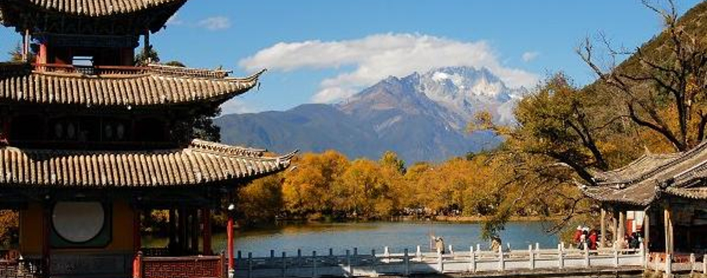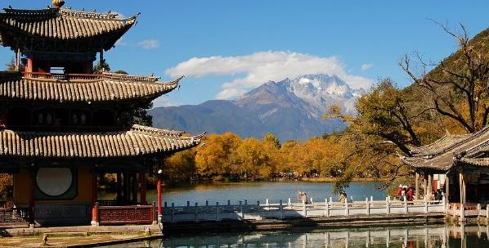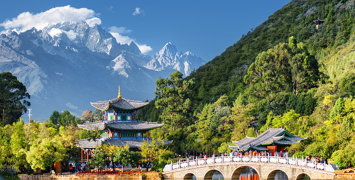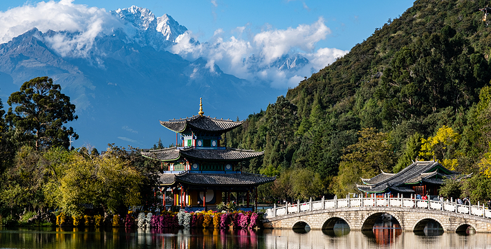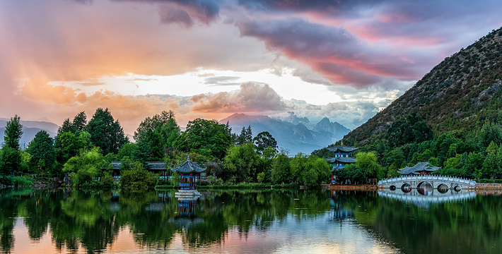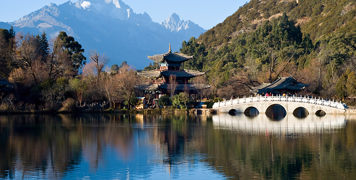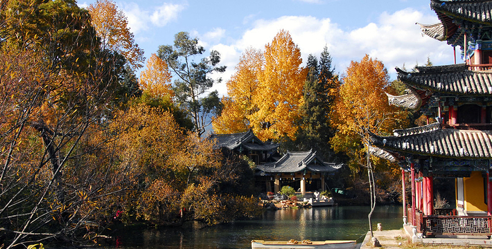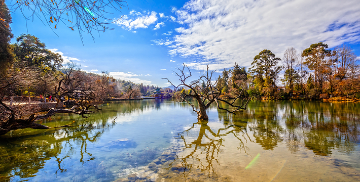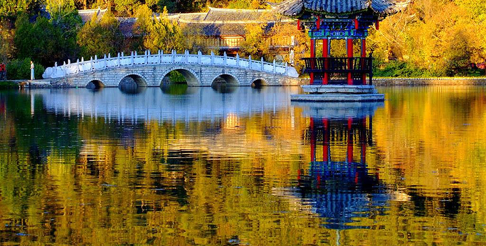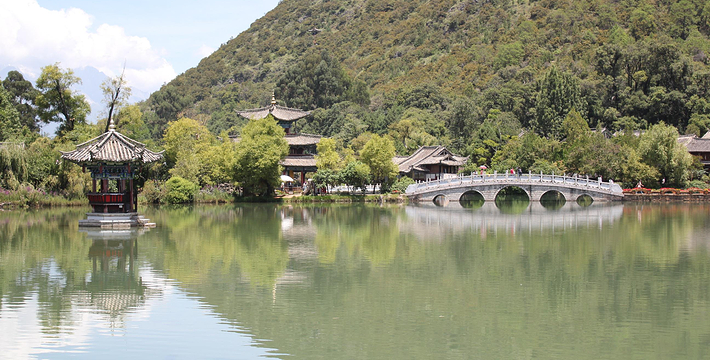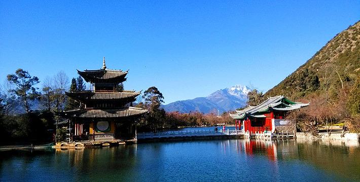 黑龙潭俗称龙王庙、玉泉公园。位于丽江古城北端象山之麓,二股泉水从象山脚下的古栗树下涌出,汇成面积近4万平方米的水潭。泉水清澈如玉,水面开着洁白的海菜花,水底游鱼如梭,潭畔花草树木繁茂,楼台亭阁点缀其间,风景秀丽。