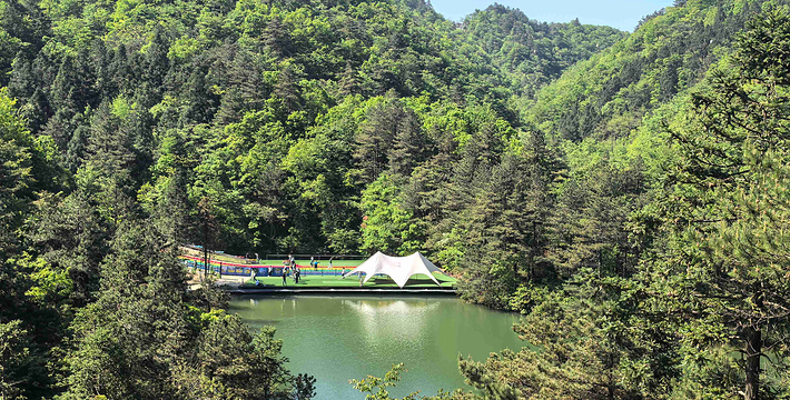 玉龙潭的上游自千亩田北龙门口以下,垂直河床骤然增大,一公里流程落差竟达四百多米,溪水劈开万仞石山,飞流直下,形成四级瀑布。