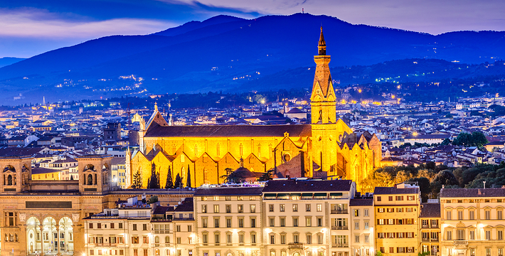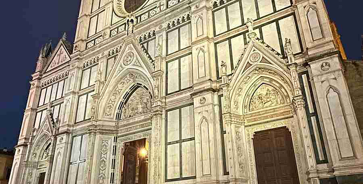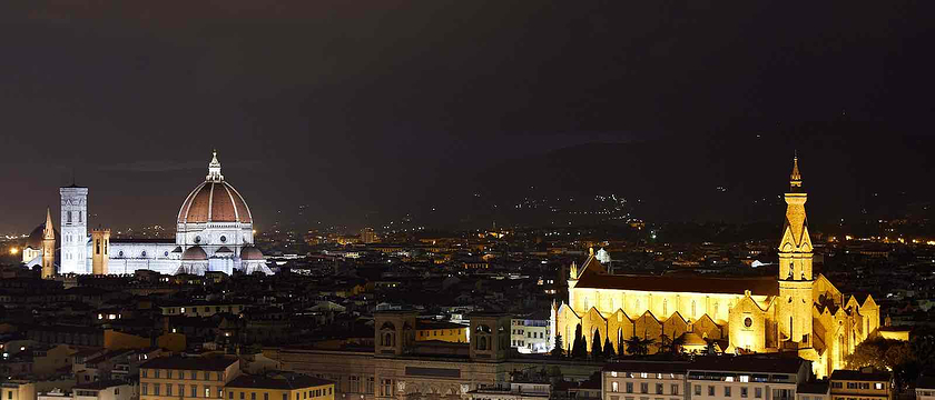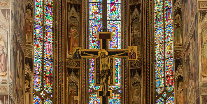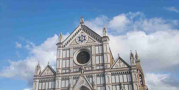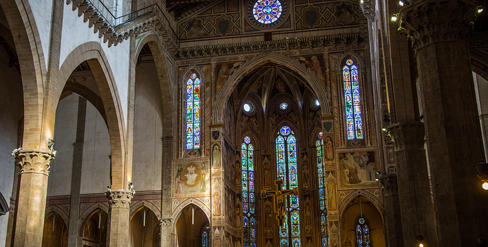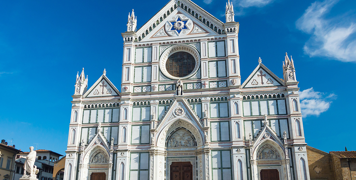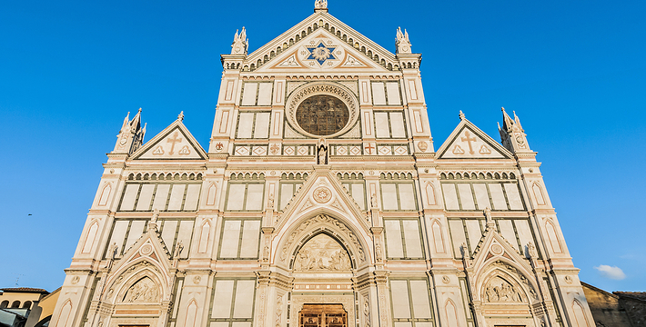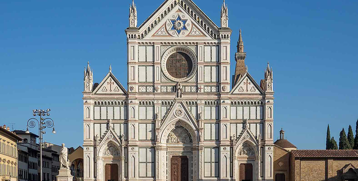 圣十字教堂 Santa Croce,旁边附属的僧房庭院与布鲁内莱斯基建造的帕兹家族礼拜堂构成的空间具有无可比拟的美,被称为是佛罗伦萨文艺复兴建筑的浓缩。圣十字教堂面积为 140m x 40m的教堂内部有被这个城市驱逐、死于拉文纳的但丁的纪念堂以及米开朗基罗、玛恰威里、罗西尼等276人的墓。与这些人相应的是内部的装饰也出自许多艺术家之手。5根廊柱上德纳特罗作的金色浮雕(圣母领报)和正殿的巴尔迪礼拜堂内乔托的湿绘壁画(圣弗朗西斯科的一生(Lavita di San Francesco))、左侧廊德纳特罗的(十字架(Crocifisso))。帕兹家族礼拜堂的旁边有圣十字博物馆 Museo dell’Operadi s. Croce,那里有契玛威和德纳特罗的作品。