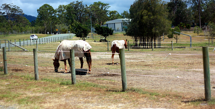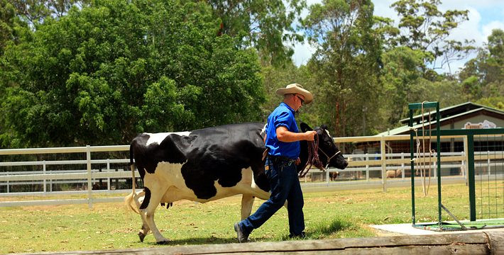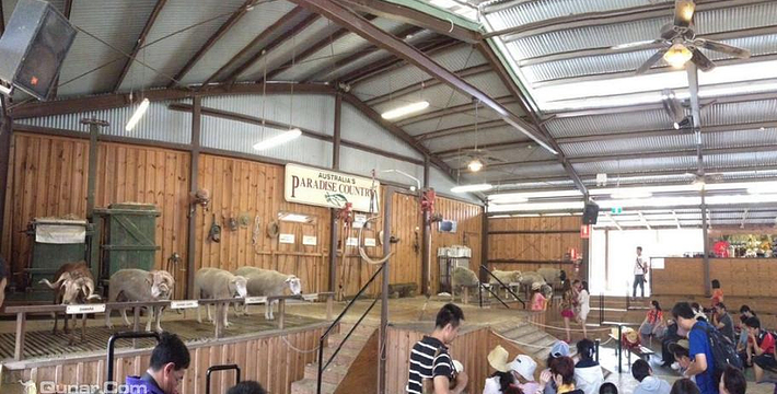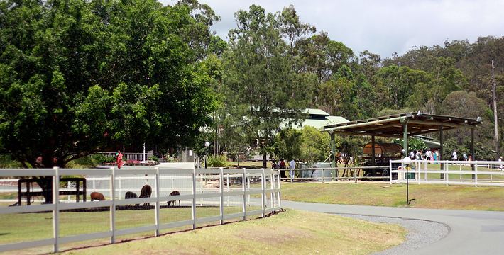 想象中的澳大利亚农庄本来应该是养羊、养牛或种葡萄兼酿酒的,但是天堂农庄主要是供旅游者参观的,不知道这是农庄主人灵活的经营适应环境还是政府旅游部门的安排设置。天堂农庄占地12公顷,可供旅游者参观的项目主要有极具澳大利亚传统农庄经营特色的剪羊毛、烹煮比利茶、马术演示、牛仔表演甩鞭、牧羊犬表演驱赶羊群、挤牛奶等,那些传统农庄里典型的日常营生被集中起来以表演的形式展示给旅游者领略和体验。为了丰富参观的内容,农庄里还增设了专门的区域分别豢养着中看不中用的考拉、本应该野生的袋鼠和鸸鹋,因为这三种动物是生活在大洋洲大陆的特有野生动物品种。条件所限,大洋洲另外的特有品种鸭嘴兽、小企鹅等就无法豢养在农庄里。农庄铺展在起伏和缓的草地上(其实整个澳大利亚就是铺展在起伏和缓的巨大的草原和沙漠上),围栏分割出好些个区域,房舍、牲口棚、栅栏围起来的一块块大小不等的场地随意散落,还有特为旅游者准备的商店和洗手间。