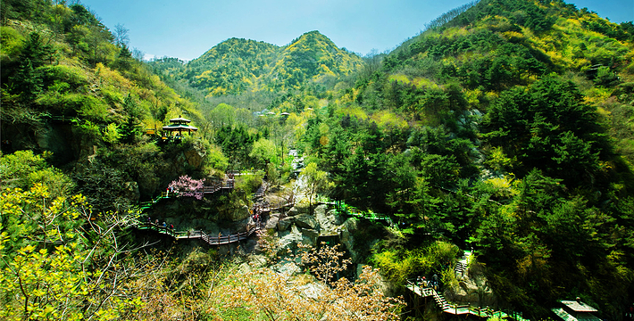 九如山群山连绵,峰峦层叠,俏石嶙峋,卓异多姿,跌落为深壑幽谷,隆起成高巅峭壁,其中海拔超过800米的山峰就有三十六座之多。