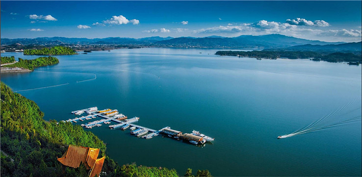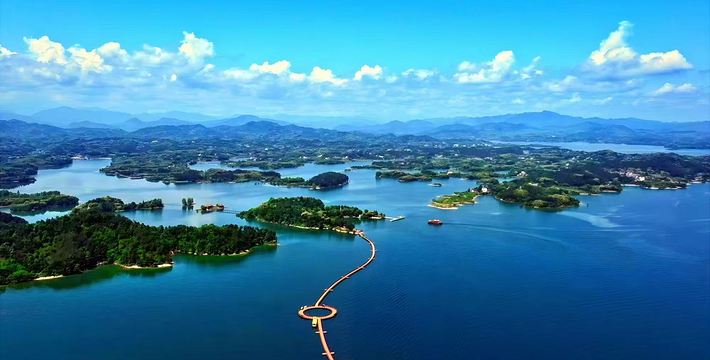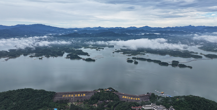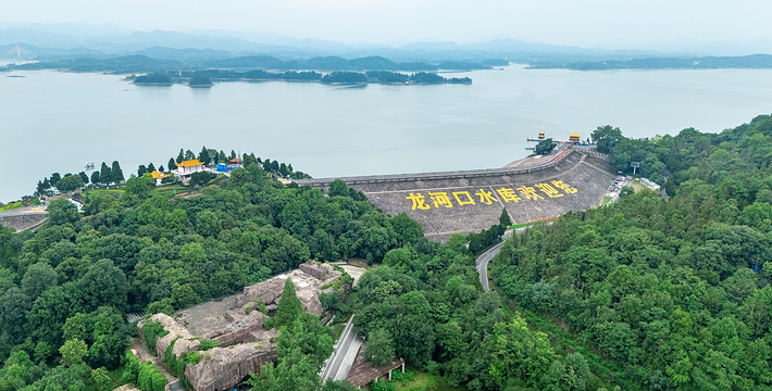 万佛湖风景区,位于安徽省中部的舒城县境内。是中国首批“国家水利风景区”,曾获“全国部门造林绿化400佳”的光荣称号和安徽省“九五”旅游接待贡献奖。中外游客对她有“安徽千岛湖”之誉,其每年接待游客人次已跻身安徽省风景名胜区的前列。万佛湖风景区是以万佛湖为中心的湖泊型观光风景区。景区面积299平方公里,湖面50平方公里,容水8.2亿立方米。万佛湖即龙河口水库,是举世闻名的淠史杭灌区的重要组成部分,安徽十大水库之一。龙河口水库1958年动工兴建,1960年建成受益,以后陆续兴建配套设施,1969,历时十一个春秋。“修水库实现千年理想,锁蛟龙造福万代子孙”。水库大坝为“粘土心墙沙壳坝”,全长1000多米,海拔高度75.4米,总计完成土方160万立方米,巍然耸立在龙河寨和栲栳山之间。令人惊叹的是,它完全是以人工肩挑手推的土法而筑成”。原联合国大坝委员会主席兰希先生称赞龙河口水库大坝是一项“非常了不起的工程”。龙河口水库为何又称万佛湖?原来龙河口水库纳晓天河、龙河和滑水河之水,库区流域面积达1111平方公里。诸河流自千山万壑”,海拔1359米,系 舒城、桐城、庐江、潜山等县境内的众山之祖。老佛顶下丹峰上有一座高2米、宽1米的“自生石碑”,系舒城县级保护文物。碑上有刻于清光绪年间的“万佛名山”四个大字,历百年雨雪风霜而未湮灭,至今仍以苍劲、秀逸的面容昭示游人。