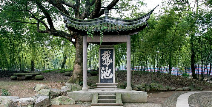 鹅池亭为一三角亭,内有一石碑,上刻“鹅池”二字,“鹅”字铁划银钩,传为王羲之亲书;“池”字则是其子王献之补写。一碑二字,父子合璧,乡人传为美谈。