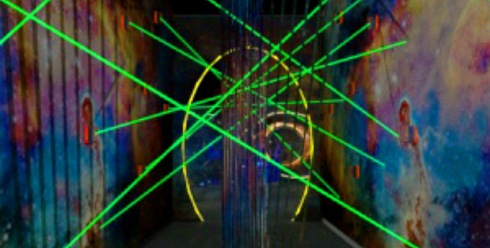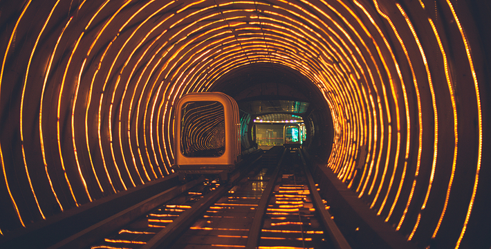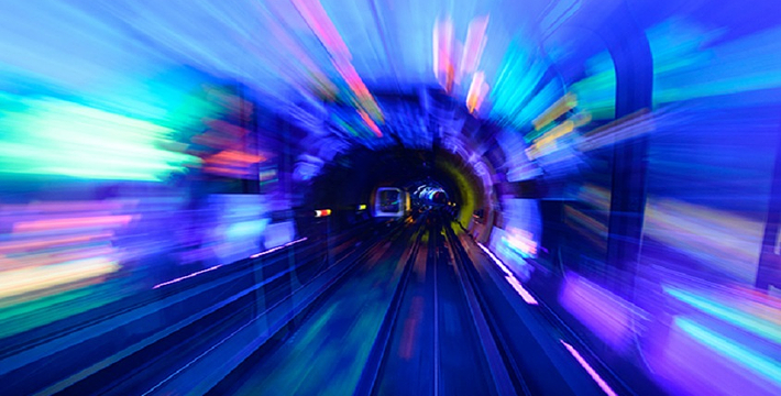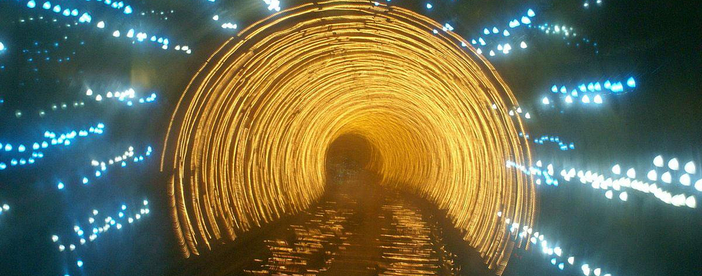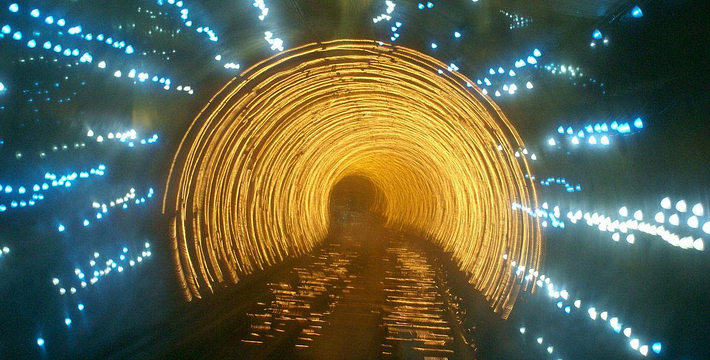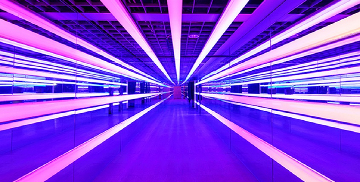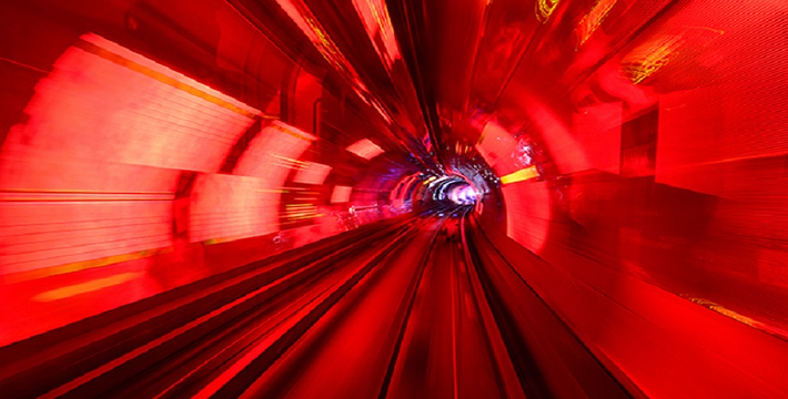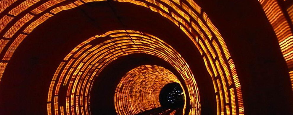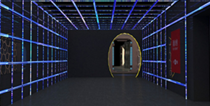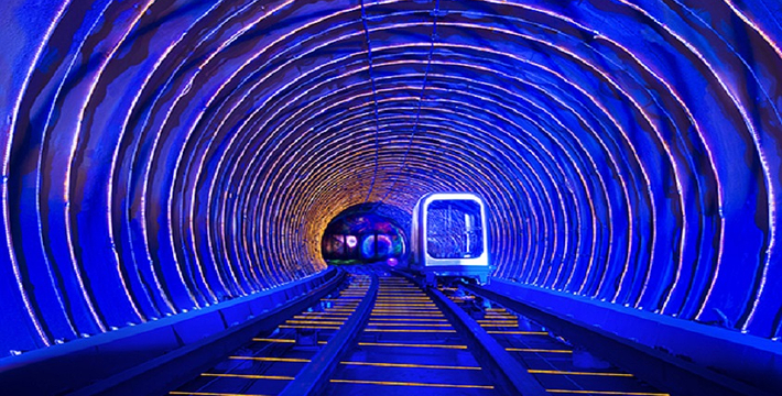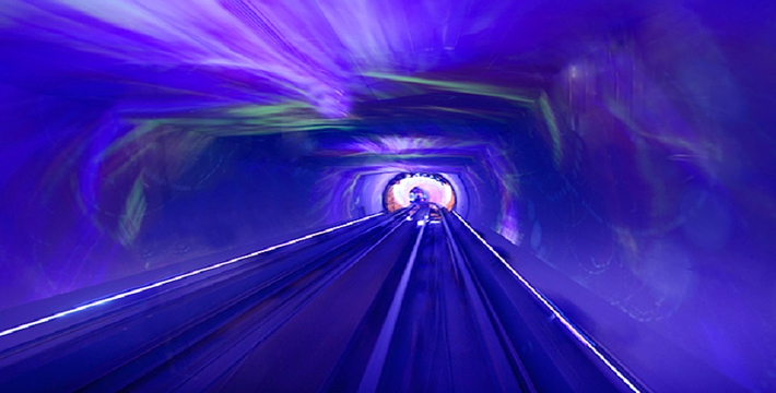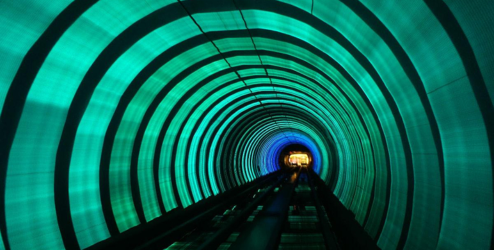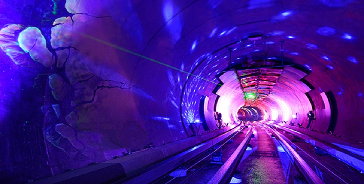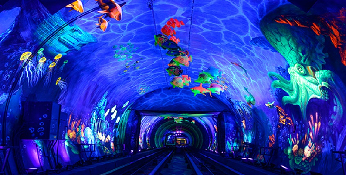 隧道内壁由高科技手段营造的各种奇异的色彩变换不停,黄色的海星,粉色的花朵,形状各异的几何图案,各种充满生机的地球生物,跃动著生命的力量,引人遐思。