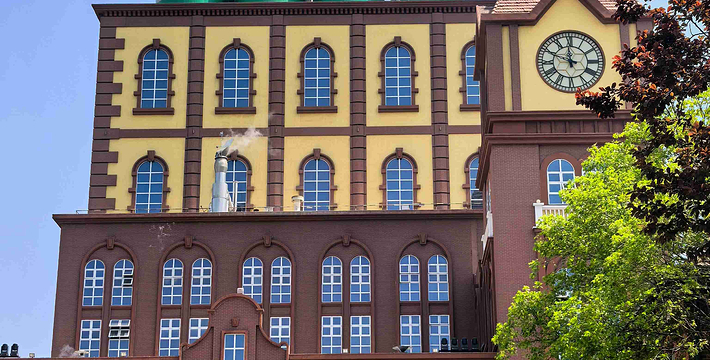 青岛啤酒博物馆设在百年前的青岛啤酒厂老厂房内,一幢幢红色的洋房很有味道,靠马路的一幢房子屋顶上,装饰着一排排超大啤酒罐,格外醒目。