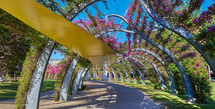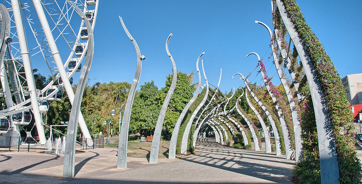 南岸公园(South Bank Parklands)原本是1988年万国博览会的会场地址,在展览结束后,市政当局原本想改建成公寓住宅,遭市民反对,而后改弦易辙,成为一个亲水公园,除了餐饮与停车费之外,完全不收费,是所有市民休闲放松的好去处。公园位于布里斯班河南岸,占地16公顷,园内有水质清澈的柯达海滩和青葱的林荫草地,你可以在这里野餐和烧烤,可以乘着游艇欣赏园林景致,也可以骑自行车穿越树林,或者是在广场上观看街头表演或者是进电影院看场超大银幕的电影。