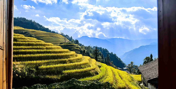 在这里可以看到一层又一层的梯田就在脚下,层层的梯田仿佛手牵着手从河水湍急的金江河盘旋而上,一直修建到白云缭绕的山头。