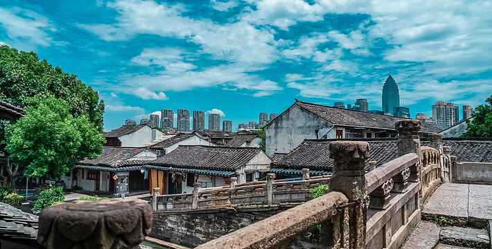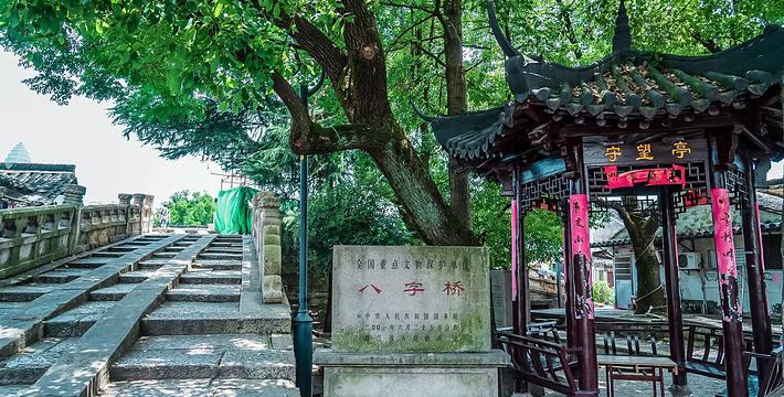 八字桥处广宁桥、东双桥之间。据《嘉泰会稽志》记载,始建于南宋嘉泰年间(1201-1204),南宋四年(1256)重建, 桥以石材构建,结构造型奇妙,八字桥陆连三路,水通南北,南承鉴湖之水,北达杭州古运河,为古代越城的主要水道之一。这里位处三街三河四路的交叉点,桥呈东西向,为石壁石柱墩式石粱桥,三向四面落坡,共中二落坡下再设二桥洞,解决了复杂的交通问题。桥面条石并列,长4.85米,桥高5米,净跨4.5米;桥面宽3.2米,桥东西长27米;桥东的南北向落坡各为12.4米、17.4米,桥西的南向落坡为l4米,西南落坡17米。桥上置栏,望柱头雕覆莲。桥合石壁式,高4米,东西两面各立石柱9根,主孔下西面第五根墩柱上刻有“时宝――丙辰仲冬吉日建”。西端南面的踏跺下建一小孔,跨越小河。桥下石壁转角处被纤绳磨出的痕迹,至今历历在目,可见当年舟楫之盛。八字桥附近一带,古民宅保存较为完整,政府巳作出保护规划”,越来越被海内外游客所青睐和赞叹。