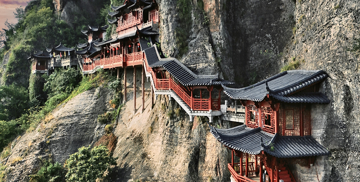 这是根据天然裂隙、由人工开凿拓宽而成的别具一格的栈道。春夏之晨或雨过天晴,山谷中的水气蒸发升腾形成云雾,站在这里,犹如腾云驾雾飘渡仙境,所以命名为“天栈云渡”。