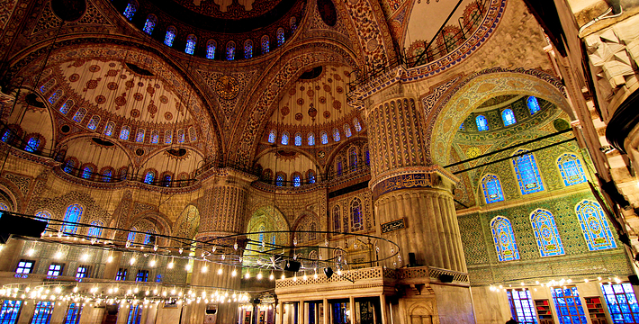 Sinan的得意弟子Mehmet Aga的作品。蓝色清真寺的美有四个观察点。穿过260个小窗的光线,溶入昏黄、呈圆型排列的玻璃灯光中,幻光明舞,像是个虚拟的空间。