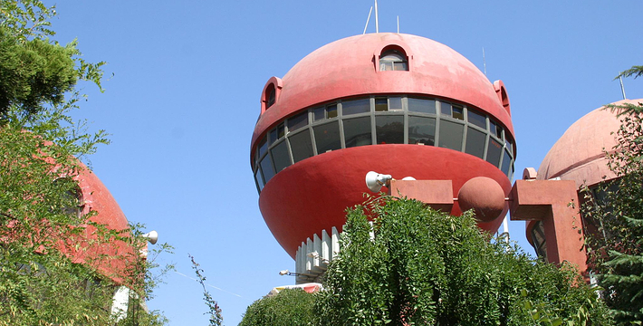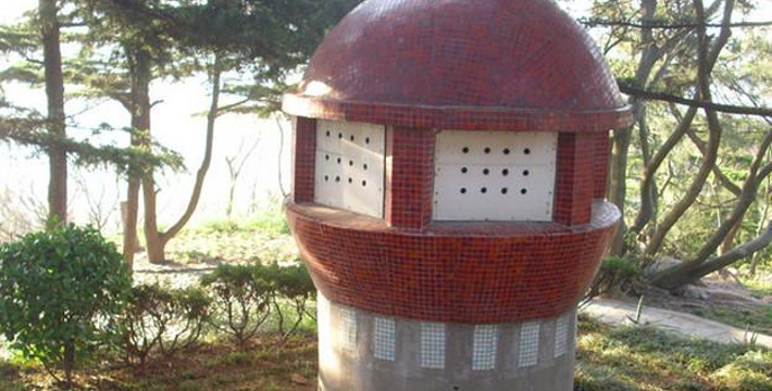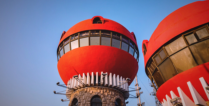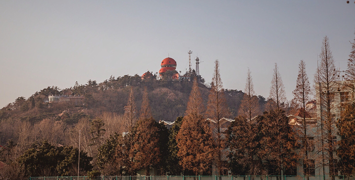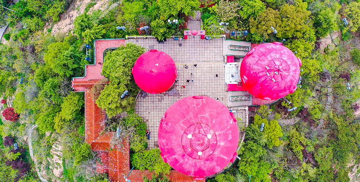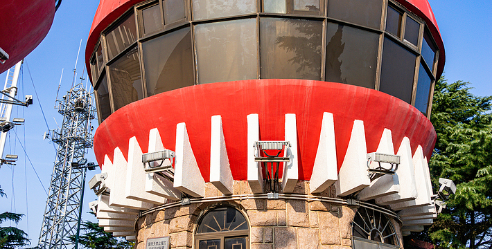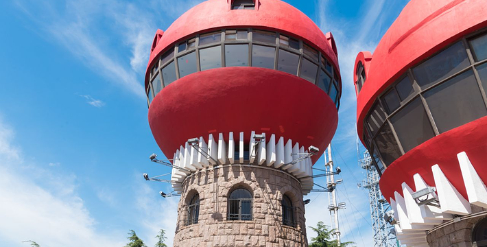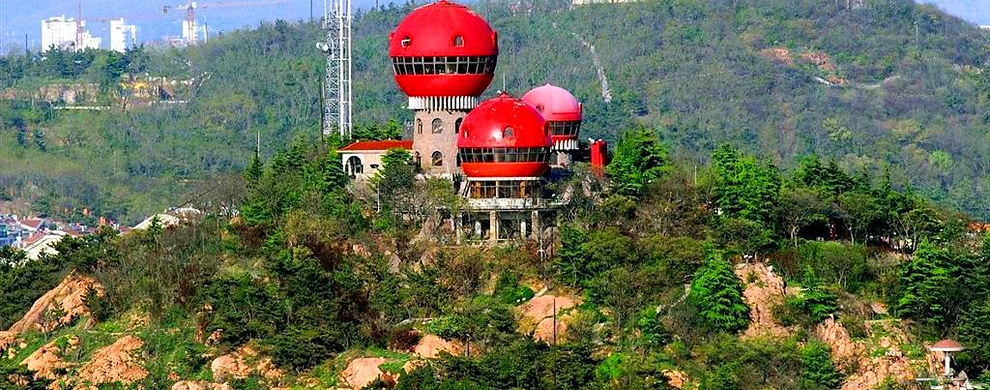 山顶三个不同高度的红色圆顶蘑菇楼,它寓意中国古代用于传递信号的三支红色火炬。