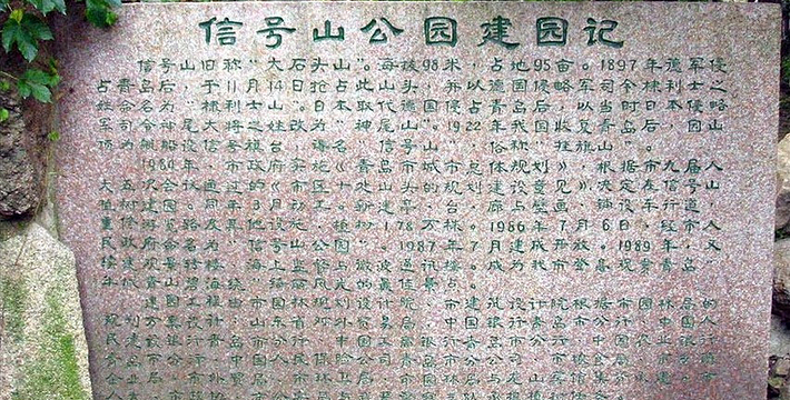 海拔98米,占地63936平方米的信号山,是青岛市较高的临海山峰。山势峻峭,怪石嵯峨,有游览路14条。主要景点有:“旋转观景楼”、“露天茶座”、“六角亭”、“蘑菇亭”、“玉兰亭”、休息长廊、拱桥、雕塑、壁画等,这些景点高低起伏,错落有致,构成一幅优美、恬静、岛语花香的园林景观,一是“端午节”,人们清晨相约上山采艾蒿,俗称“拉露水”,带回家中祈求一年无病无灾,平安无事;二是“重阳节”,即农历九月九登高,因时值初秋,天高气爽,该地又是市内制高点,故有此一说。信号山的设计别具匠心,特别是山顶上三个不同高度的红色圆顶蘑菇楼。它寓言我国古代用于传递信号的三支红色火炬。圆内观景楼,五层设有旋转观景音乐茶座,备有各种食品、饮料及各种工艺品,可容纳40余人同时观景,20分钟旋转一圈。晴天之时,登上旋转观景楼,青岛的全貌及汇泉湾的美景尽收眼底。美丽的栈桥、小青岛与碧蓝的大海交相辉映,岛城的红瓦绿树、碧海蓝天、山光水色在这里可以一览无余。