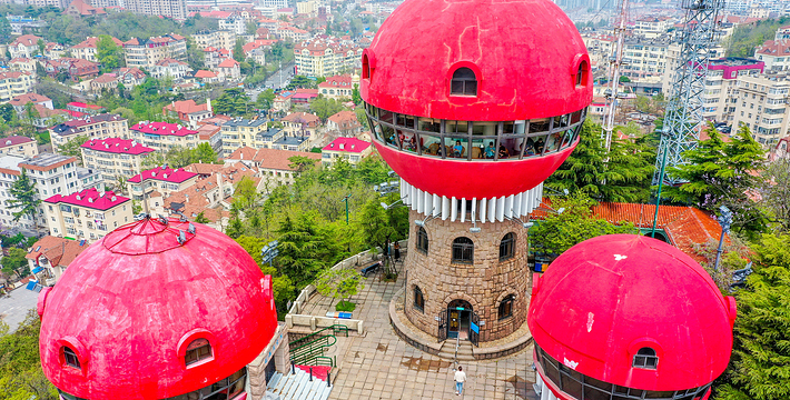 旋转观景楼上设茶座,可同时接纳几十人旋转观景,约30分钟旋转一周,为游人提供了凭高鸟瞰美丽青岛的极好场所。
