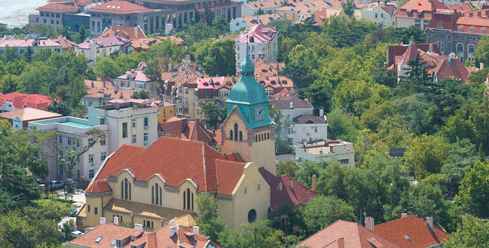 雾霭浮动之时,青翠欲滴。山坡上,造型优美的亭、台、楼、阁黄白分明,点缀其间;石阶小径,曲折回转,蜿蜒于林荫之下。更有山巅的3幢红色的蘑菇楼,宛如3柄火炬,屹立于满山青黛之中,十分夺目。这个以欧式风格规划建设的公园因山得名,即信号山公园。