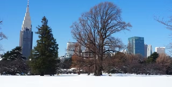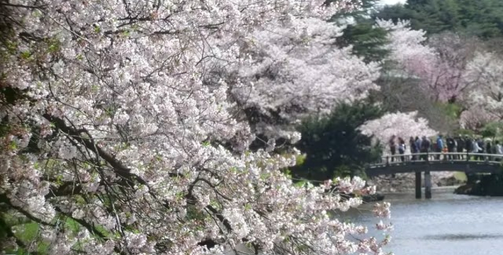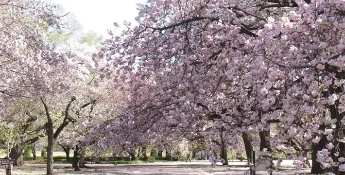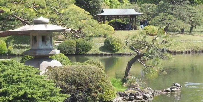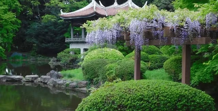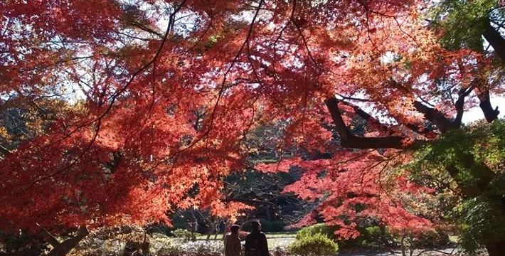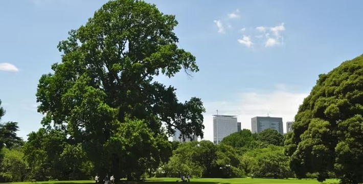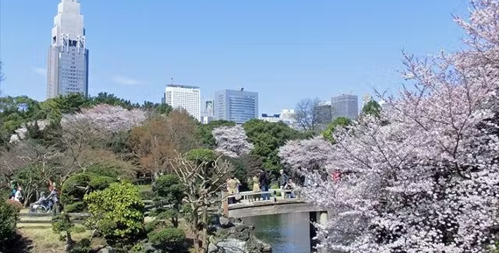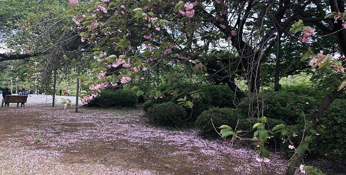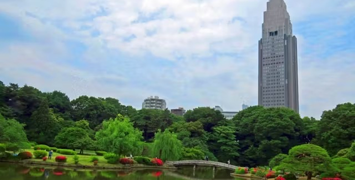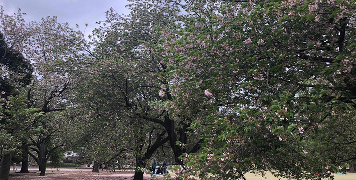 位于市中心,面积约58公顷。这里原来是信川高远藩主内藤骏河守的住宅,明治5年(1872年)改为水果蔬菜研究所,七年以后成为新宿植物御苑,二战后改立为公园。原为日本林泉式庭园,后经设计改建成法式庭园。园内林木丰茂,景色宜人,还有1500株樱花树,春天时樱花竞相开放。从2月的“寒樱”到3月的“江户彼岸”、“染井吉野”、“山樱”、“大岛樱”等,直到4月的“一叶”、“寒山”、“普贤象”、“里樱”,各式樱花竞相开放,争奇斗艳,着名的“八重红垂……