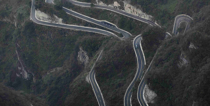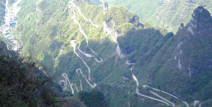 通天大道全长10.77 公里 ,但就在这么短的距离里,它的海拔却从200米急剧提升到了1300米。