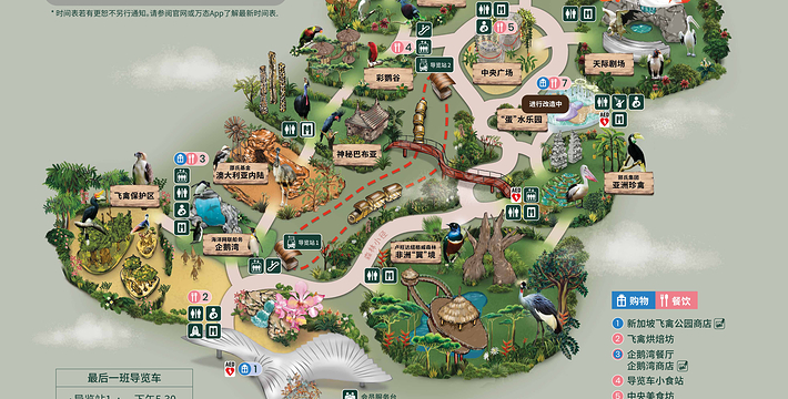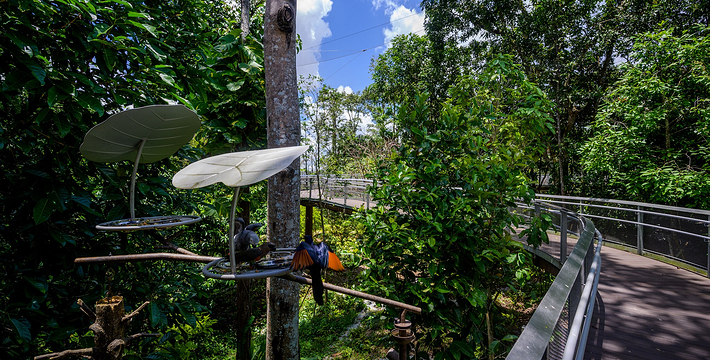 裕廊飞禽公园(Jurong BirdPark)坐落在裕廊山上,建于1971年,面积达20.2公顷。园内建有95个鸟舍、10个活动场和6个池塘,养有600多种、9,000多只飞鸟”,也是世界上少数规模庞大的禽鸟公园之一。从园中模拟南极洲环境的企鹅馆到模仿热带雨林候的东南亚鸟舍,裕廊飞禽公园都设法为鸟儿创造一个与自然环境相近的栖息之所。“东南亚珍禽屋”所展示的是东南亚地区几乎所有的珍禽和濒临绝种的鸟类,有自由飞翔的各种鸟1200多只。“企鹅宫”是全世界第二大企鹅展示区,人们可在观赏台欣赏笨拙可爱的企鹅在水中畅游和进食的神态。 飞禽表演也是很吸引人的节目,驯鸟者一声呼唤,巨大的雄鹰、猫头鹰好似“飞将军从天而降”,由几百米处的山林飞到露天表演场的表演者手上。各种鹦鹉在表演者的指挥下不仅会讲“Goodbye(再见)”、“Hello(你好)”等英语单词,还会模仿狗叫、猫叫、鸡啼,充分显示了高超的模仿能力。人工大瀑布是飞禽公园的另一景色,水流自30.4米的高处飞流而下,形成了美丽壮观的大瀑布,同时发出轰轰的声响,气势磅礴。然后利用地图徒步游览公园。裕廊飞禽公园是新加坡旅游奖 1999 及 2000。