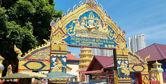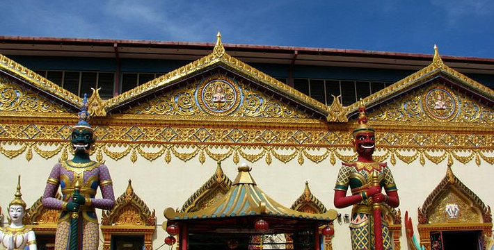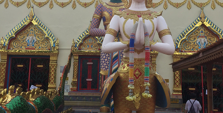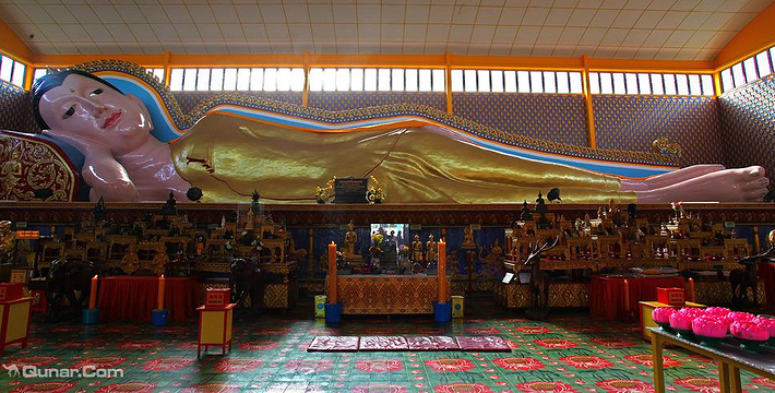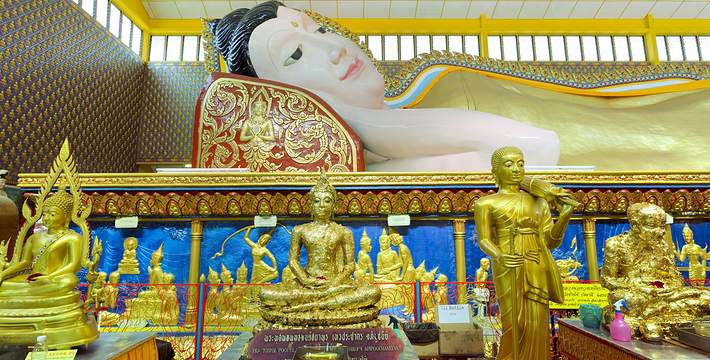 这座泰国的寺庙建于 1845 年,是一座金碧辉煌的佛寺。卧佛全长33公尺,全身用金箔装饰,是世界第三大的睡佛,现在由华人负责守护。除了睡佛外,还有十八罗汉像和其他的神像。