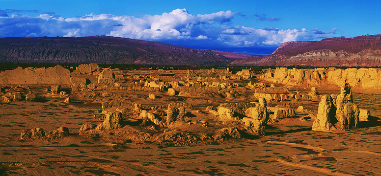高昌古城维吾尔语称亦都护城,即“王城”之意,曾是高昌王国的都城,位于吐鲁番市东面40多公里的三堡乡。 高昌,至今不少文人墨客,仍常用“高昌”作为吐鲁番的代名词。故城历史悠久,公元前一世纪始建高昌壁,实用一千三百多年,于公元十三世纪末毁于战火。虽然经过二千多年的风吹日晒,故城轮廓犹存,城墙气势雄伟屹立在火焰山下。高昌古城规模宏大,十分壮观。总面积200万平方米。城呈长方形,周长5公里,分外城、内城、宫城三部份。类型于唐代长安城的形制和布局,全部由夯土版筑而成。外墙基宽12米,墙高11.5米。全城有九个城门。其中南面有三个城门,东、西、北面各有两个城门。进入城内,可参观外城墙、内城墙、宫城墙、可汗堡、烽火台、佛塔等留存较为完整的建筑,其它的残破土墩、败落壁垣,就只能由人想象和继续考证了。高昌城废弃后,日益蚕食被垦成耕地,大部分建筑物消失无存。尚存较好的遗迹有,外城西南和东南角保存两处寺院遗址。其中西南角的一所寺院,占地约一万平方米,由大门、庭院、讲经堂、藏经楼、大殿、僧房等组成,东南角的寺院,尚存一座多边形的塔和一个礼拜窟。内城北部正中有一座不规则的方形小城堡,当地人称“可汗堡”。 佛寺两侧曾立着高大的佛塔,院内正中有残存塔柱,而佛龛内则残存着菩萨像和壁画。据考证,这是当年唐僧玄奘西游路过高昌国时,被国王菊文泰挽留一月讲经之处。游人若要拍故城全景,可在晴朗之日登上南边城墙拍摄。 1961年高昌古城被列为国家重点文物保护单位。