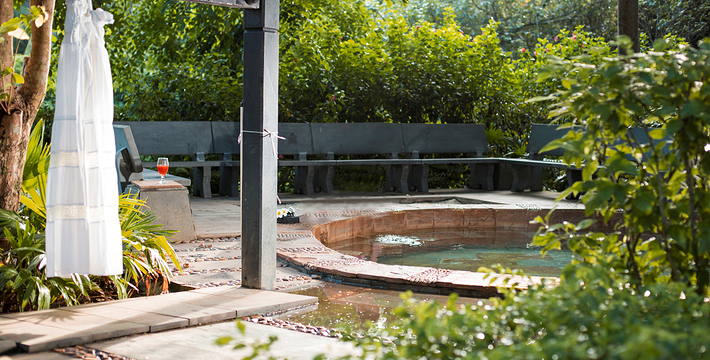 椭圆型的喷泉池结合“鳌”身形状作了个抽象化的设计,池内喷管分为三层,从内而外,由不同粗细的喷管组成,喷泉喷涌得错落有致,层次分明,别出心裁。