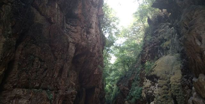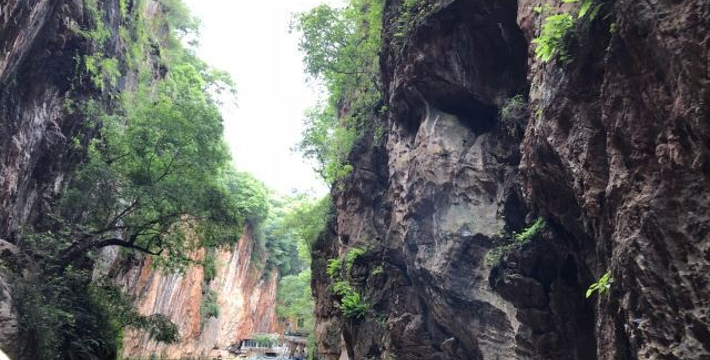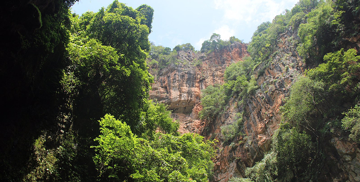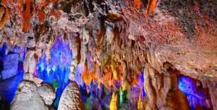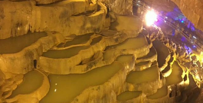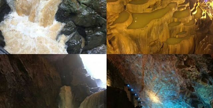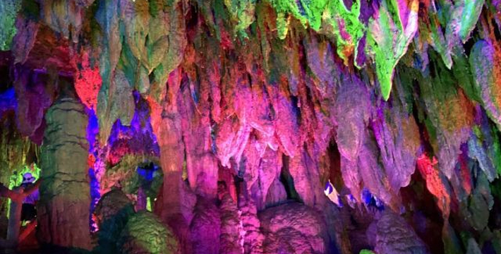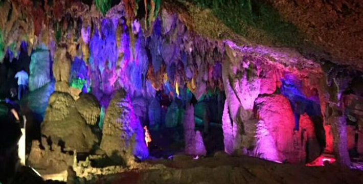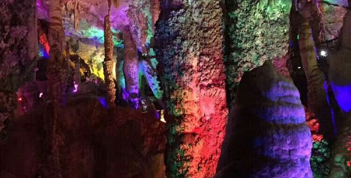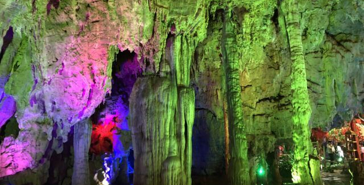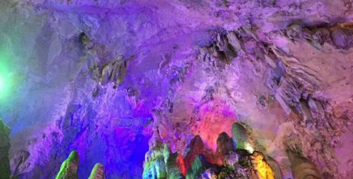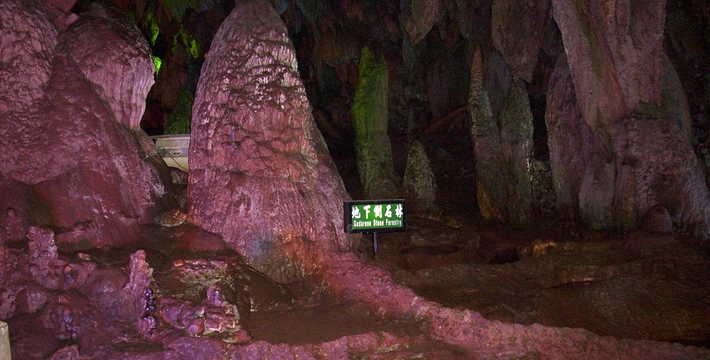 地下倒石林以洞中钟乳倒挂垂悬,酷似石林倒悬而著称。洞长250米,其间空气清新流畅,气温凉爽宜人仿佛设有天然空调一般。这里的石头为什么会是垂直倒悬的呢。实际上还是风的缘故,由于洞外和洞内的温差不同而形成了不同流向的风,又加上这些地下生成的钟乳石本身具有的毛细吸管可以输送水份,形成水滴,在碳酸钙即将沉淀的时候,被风吹离了垂直的方向,故而形成了旁逸斜出的形式。所以说蝙蝠洞中倒垂的钟乳石是风吹弯了的却一点都不为过。