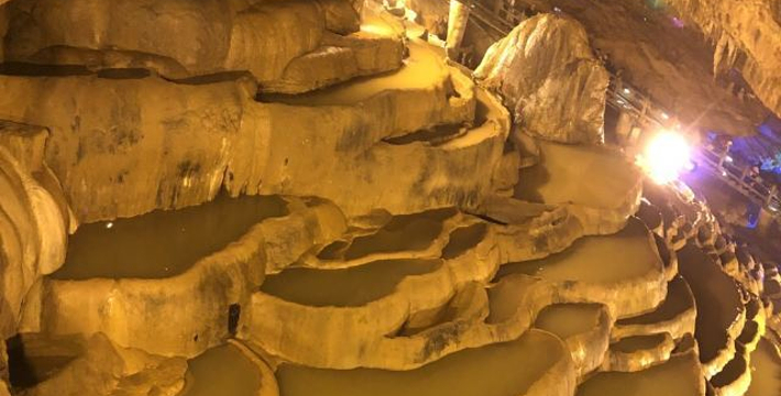 世界上所有向下生长的钟乳石几乎都是垂直向下的,只有九乡蝙蝠洞中的钟乳石,似乎地下倒石林是摆脱了地球引力的作用,变得旁逸斜出,拙朴可爱。远远看去,如同石林倒悬,故而又有地下倒石林的赞誉。而实际上则更象错落有致地倒挂了许多正在风干的牛肉干巴。