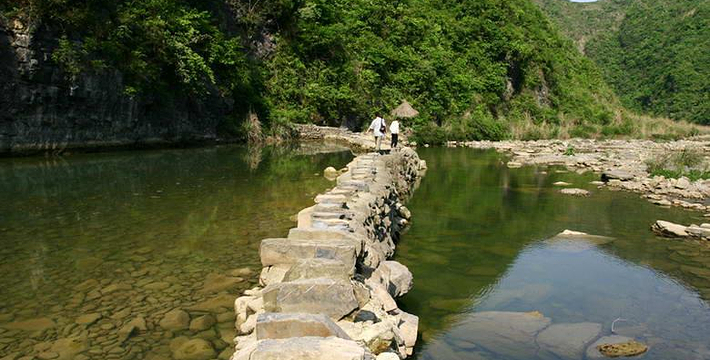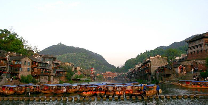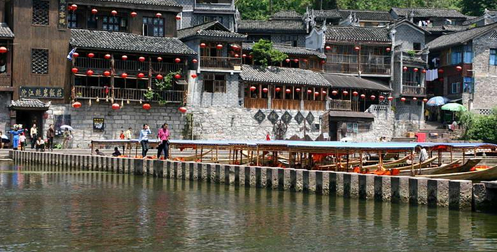 沱江跳岩,全长100米,共15个岩墩。从跳岩中间来眺望沱江。乾嘉苗民起义,辛亥革命凤凰光复起义、解放战争,这里都是进攻古城凤凰的主要通道。作为曾经进出凤凰古城的主要通道之一,跳岩对于凤凰人的意义是非同一般的,挑着山货的行人,穿着鲜艳色彩苗服的苗女,每天络绎不绝的从这里走过,形成了一处动人的风景。