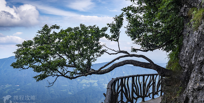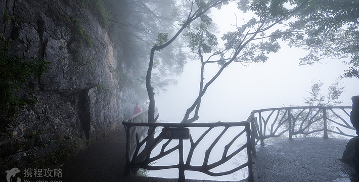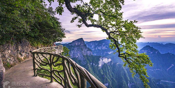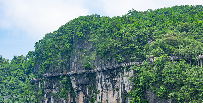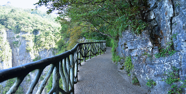 鬼谷栈道,位于觅仙奇境景区,因悬于鬼谷洞上侧的峭壁沿线而得名。栈道全长1600米,平均海拔为1400米,起点是倚虹关,终点到小天门。与其他栈道不同的是,鬼谷栈道全线既不在悬崖之巅,也不在悬崖之侧,而是全线都立于万丈悬崖的中间,给人以与悬崖共起伏同屈伸的感觉。 站在栈道上俯瞰群山,古人“会当凌绝顶,一览众山小”的感觉油然而生。由于天门山是国家森林公园,植被特别丰富,加上典型的喀斯特地貌,所以,在这条栈道上更能找到一种在乘坐直升飞机飞越热带雨林大峡谷的感觉,这平时只能在电影里看到的场景,在这里能让你身临其境。