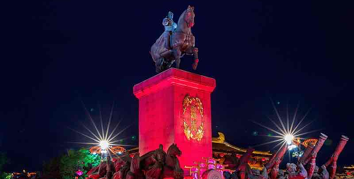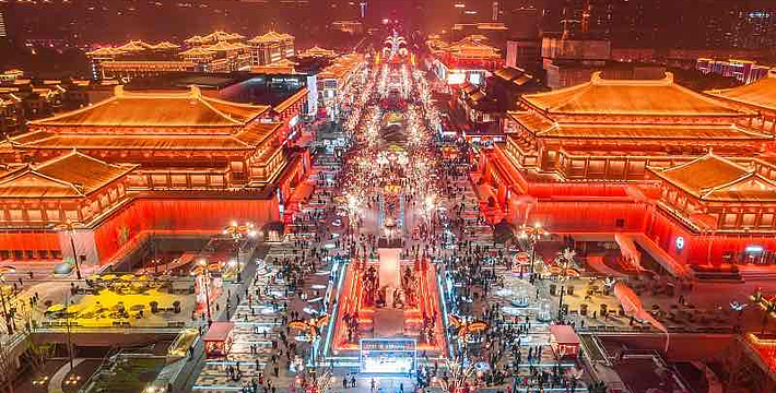 大唐不夜城项目位于西安曲江新区举世闻名的大雁塔脚下,是陕西省、西安市重点建设项目。该项目以盛唐文化为背景,以唐风元素为主线,以体验消费为特征,着力打造集购物、餐饮、娱乐、休闲、旅游、商务为一体的一站式消费天堂——MALL。大唐不夜城的中轴景观大道是一条1500米横贯南北的中央雕塑景观步行街,其上分布着盛世帝王、历史人物、英雄故事、经典艺术作品等九组主题群雕,立体展现大唐帝国在宗教、文学、艺术、科技等领域的至尊地位并彰显大国气象。
