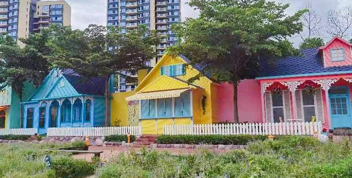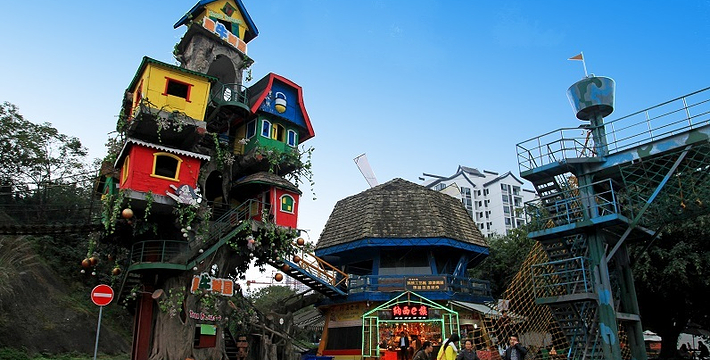 美心洋人街实际上是南滨路四期工程一段的一部分,不过由于这里是步行街,更像是一座异域的童话王国,人们已经淡忘了这里是滨江路,穿行于“街道”里的各色老外加上那些童话般的房子,更让人觉得是步入了另一个世界。这片童话世界半年不到已经颇有名气,每到周末都人流如织,其所有原因都在于它的洋气:整个街区有两条并行的观光大道,更多的则是小木屋,花一块钱就可以坐西式马车或者花车环游一番。