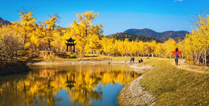 时至深秋,银杏谷内漫山遍野金黄一片,银杏树边有人居,古树傍农舍,仿佛迈入了金色的童话世界。