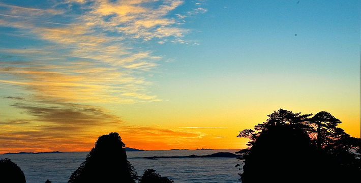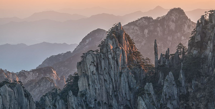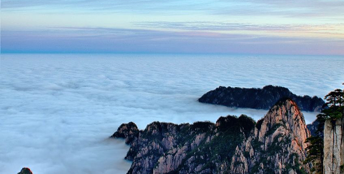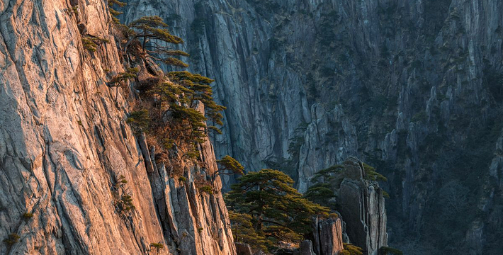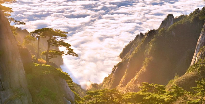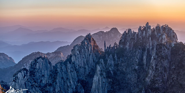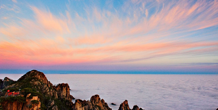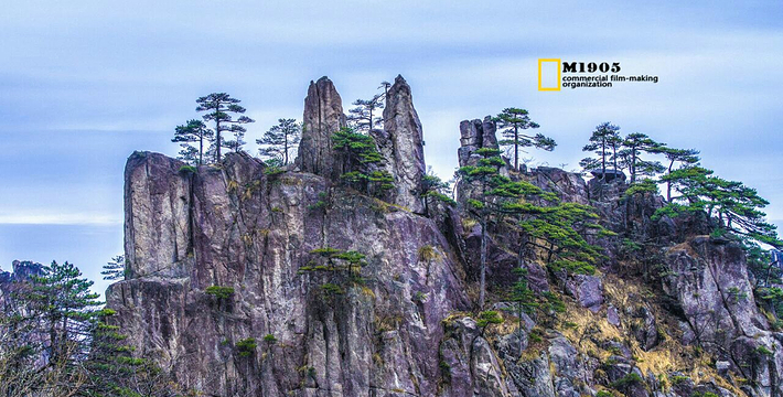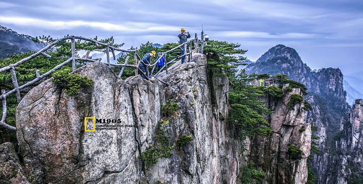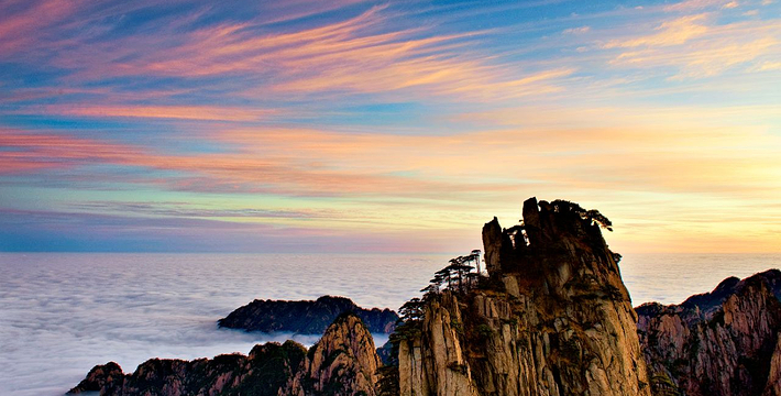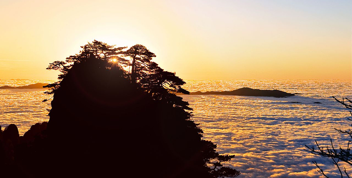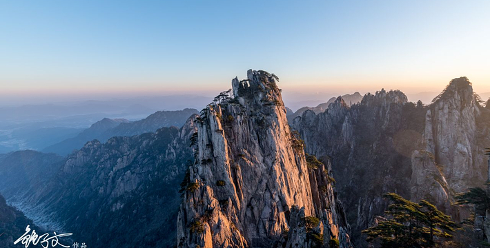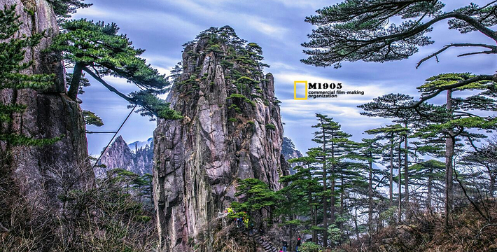始信峰:位于黄山北海之东,海拔1683米,旧传古人游黄 山,至此如入画境,似幻而真,始信黄山神奇绝妙,故名。此峰凸起于绝壑之上,四面临空,悬崖千丈,仅东南一峰相近,中隔丈许。此峰虽小巧玲珑,但巧石争妍,奇松林立,风姿独秀。历史上文人雅士,曾在峰巅饮酒抚琴,故有琴台之称。明代一乘大师曾在峰顶建“定空室”,仅一席之地。明末民族英雄江天一,隐居黄山,亦在此抚琴抒怀,留有“寒江子独坐”石刻。当代学者李一氓为其补书碑记。峰下为散花坞。明太史吴廷简登峰后赋《登始信峰》诗: